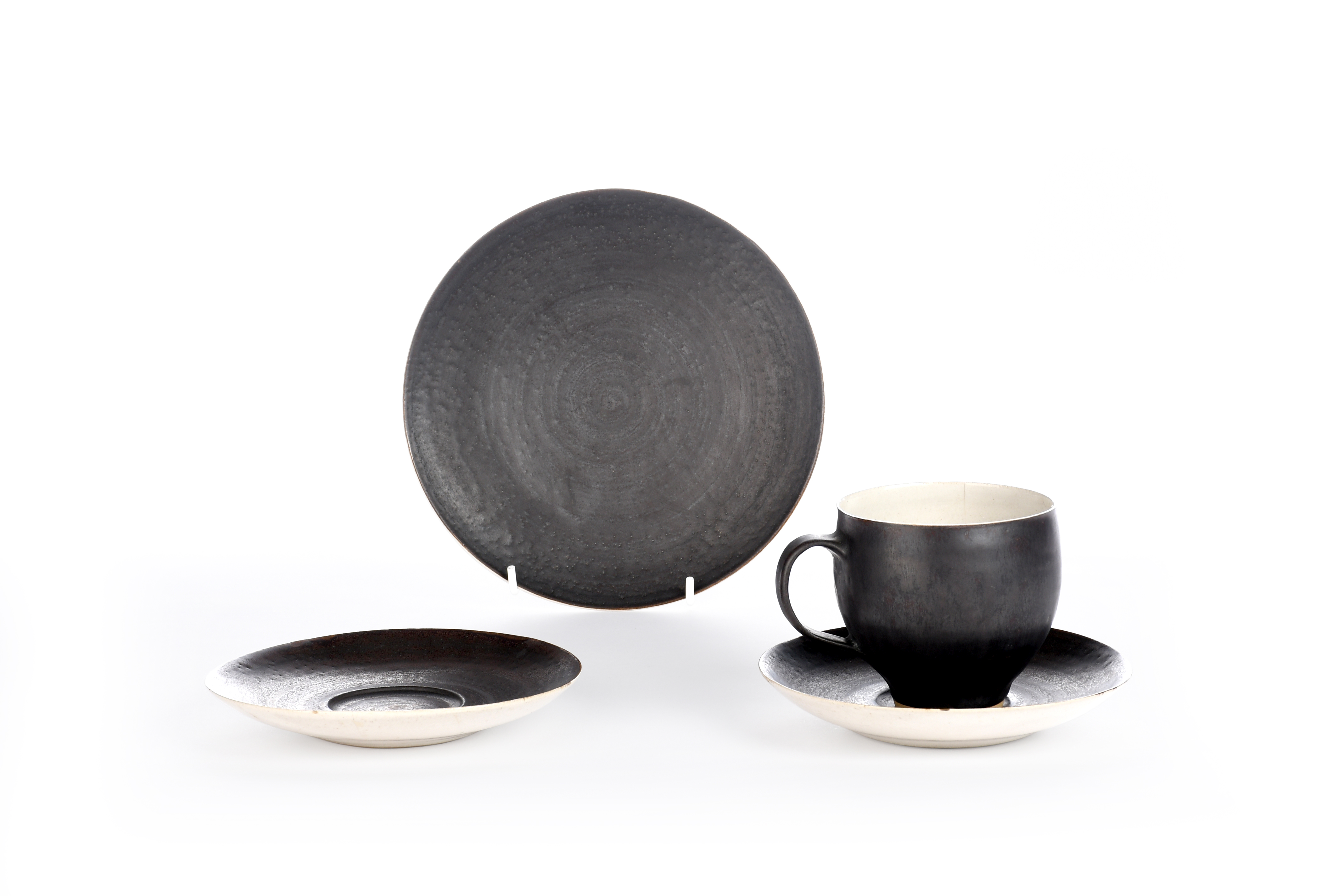 covered in a manganese glaze, the interior silver-grey, and a spare saucer