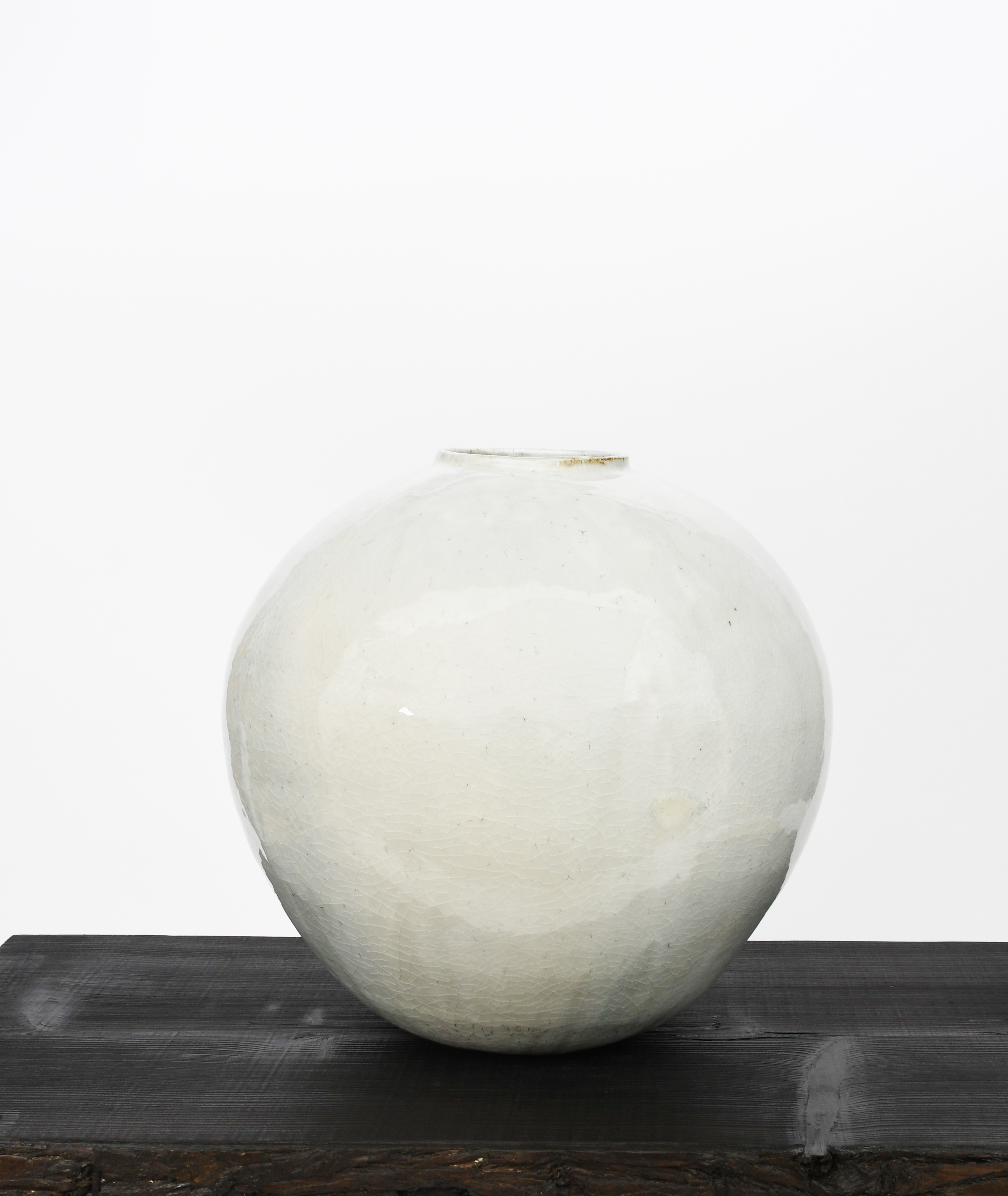 ovoid stoneware vase with collar rim, covered in a pale white porcelain glaze