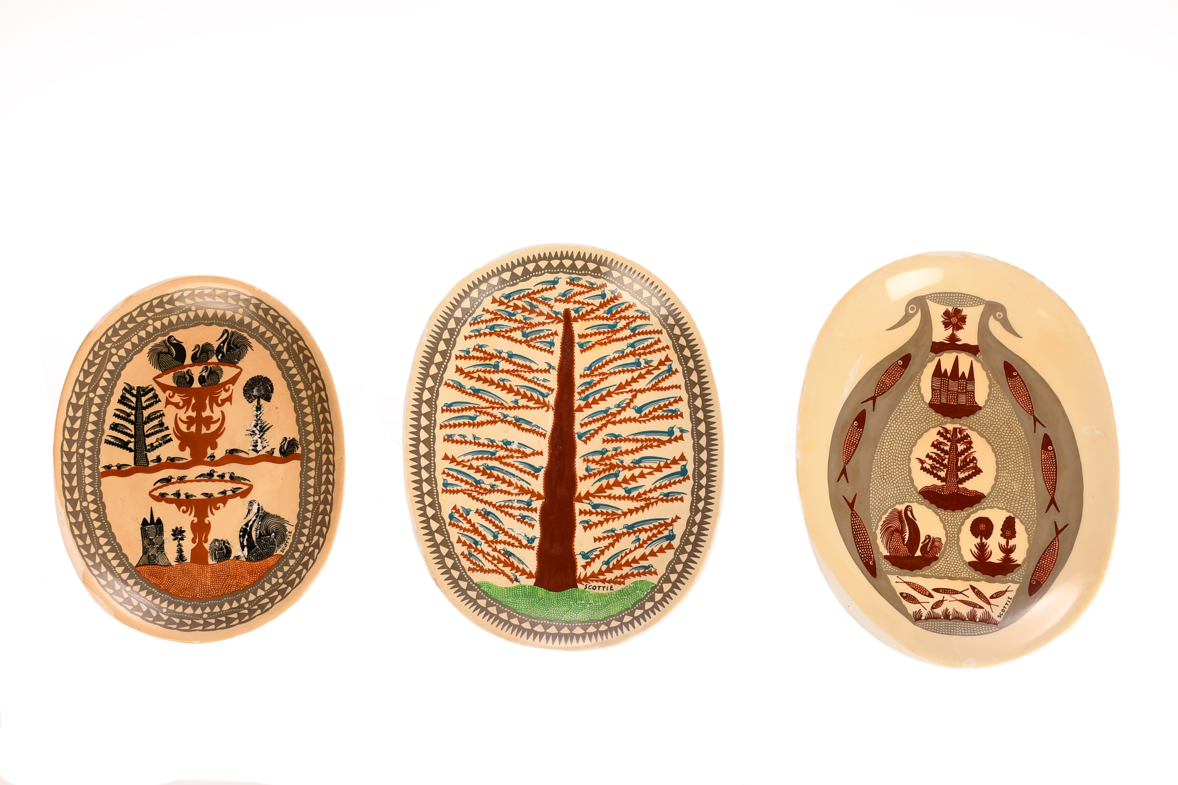 oval platter, printed and enamelled in colours with a stylised tree with a flock of birds roosting, another decorated with birds, and another decorated with panels of birds, fish and flowers,