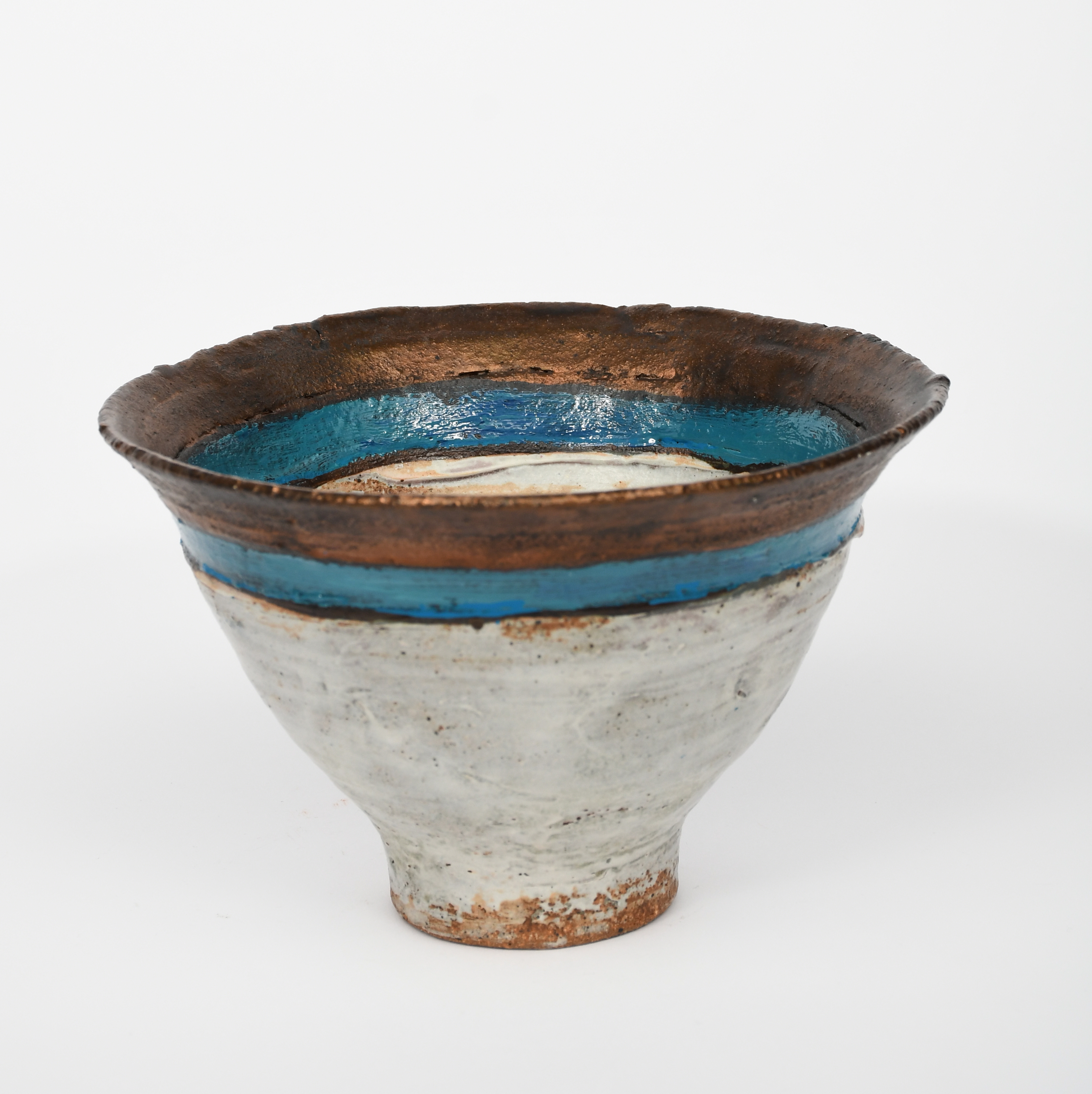 covered in a textured glaze to the foot rim, the top rim glazed manganese with blue band