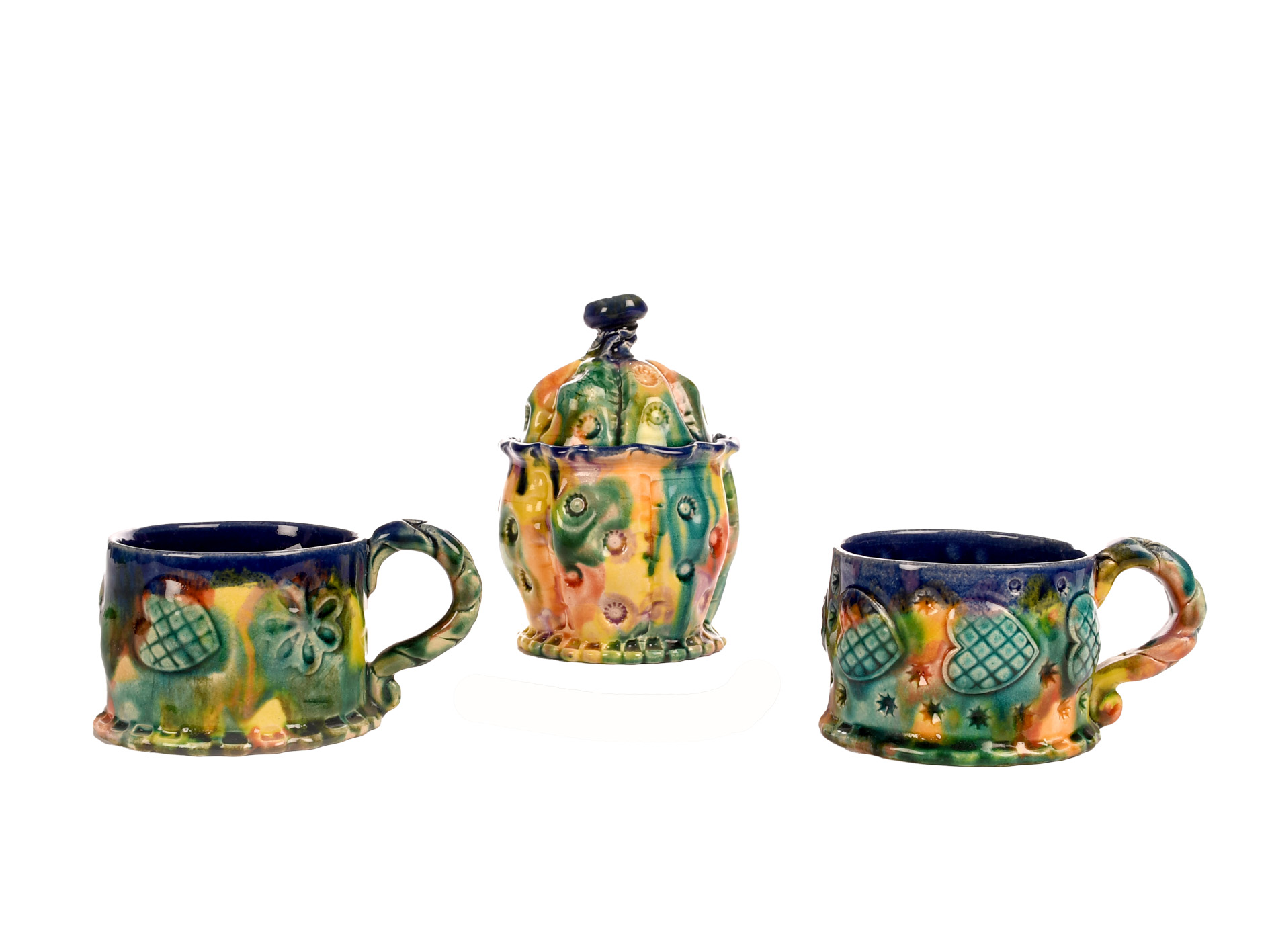 all with polychrome dripped glaze, the mugs with applied hearts running around the body