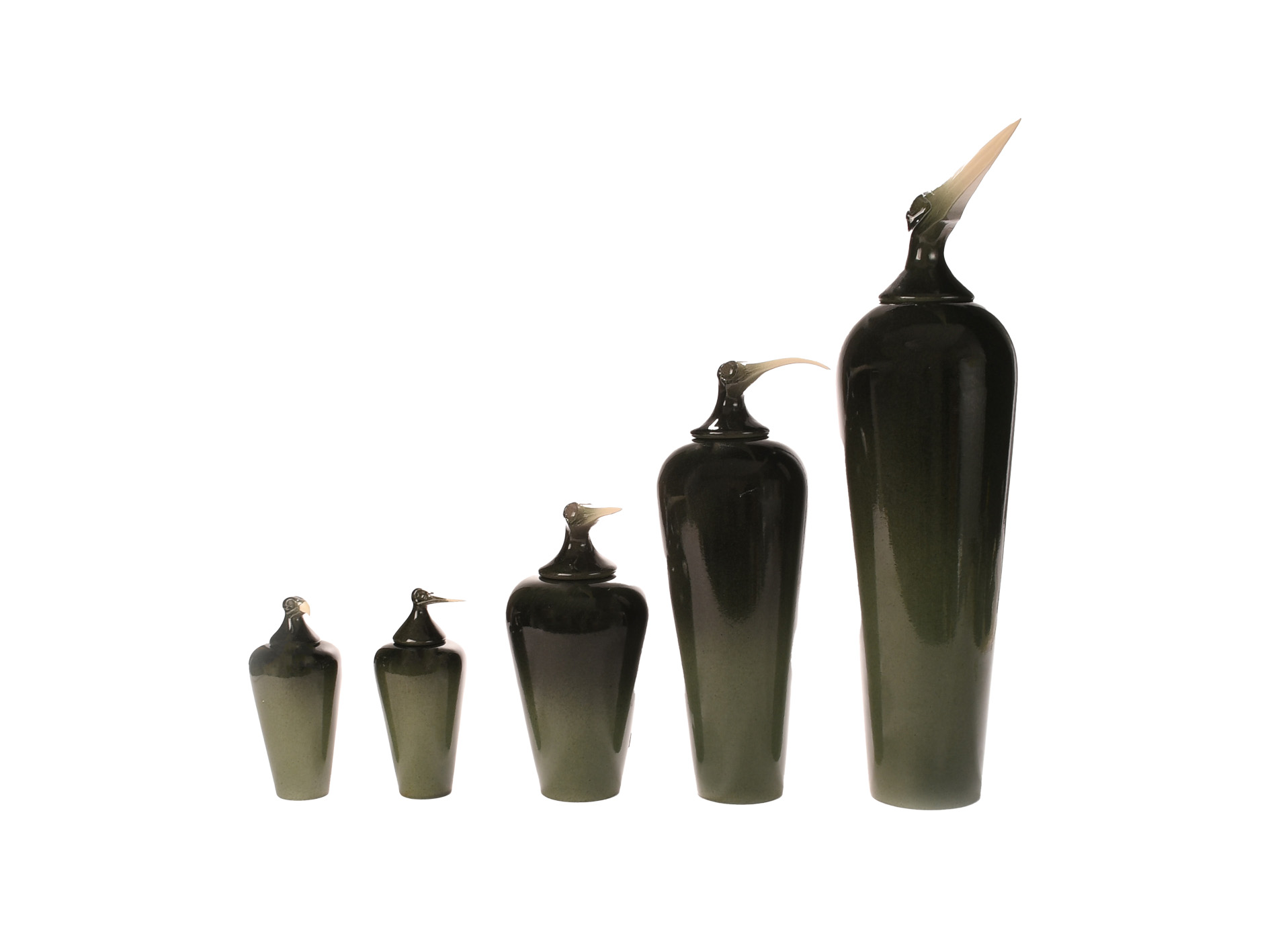 in the form of ancient Egyptian Canopic jars, each with birds head covers and a graduated green glaze