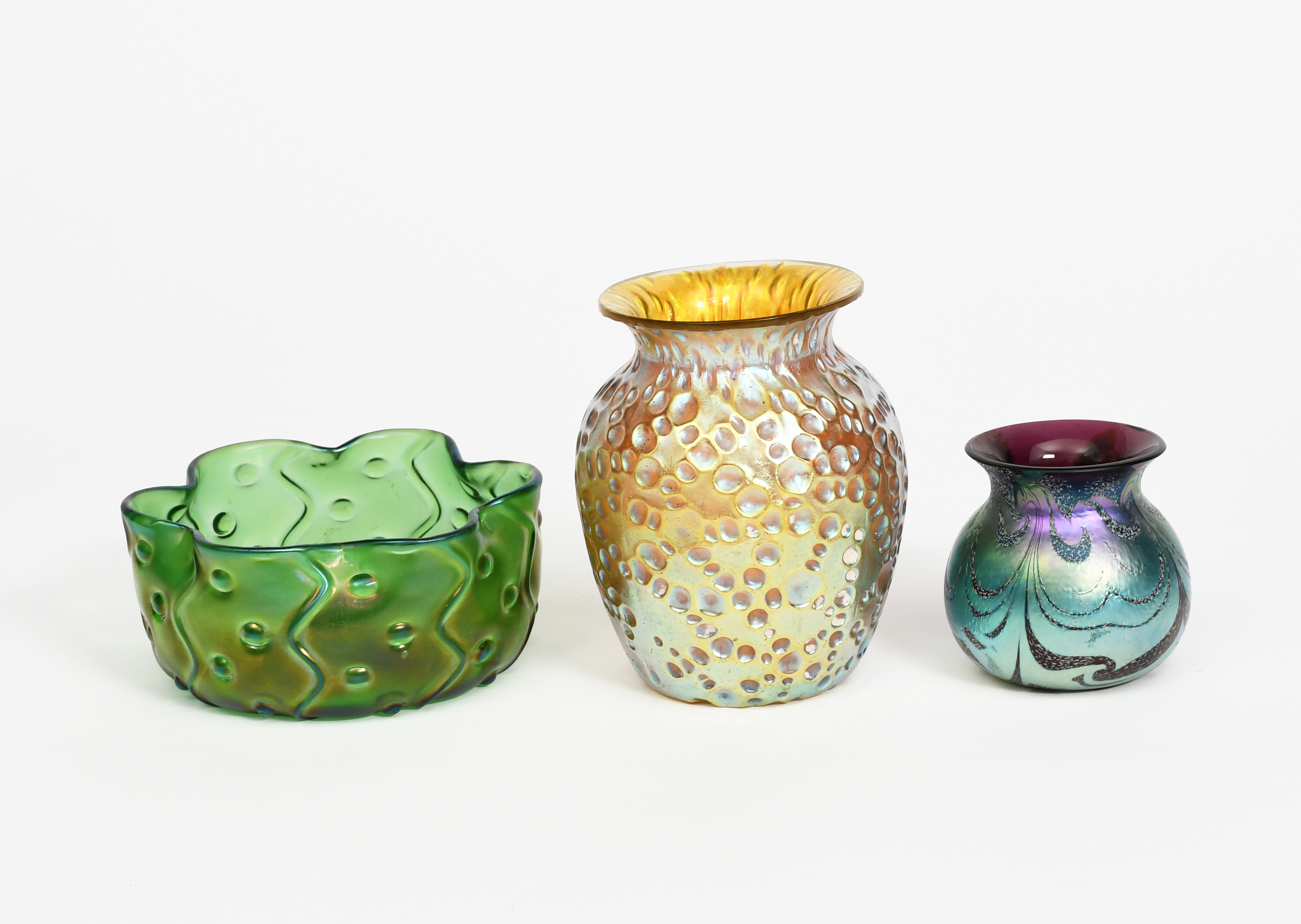 shouldered ovoid form with flaring top rim, textured with golden iridescence