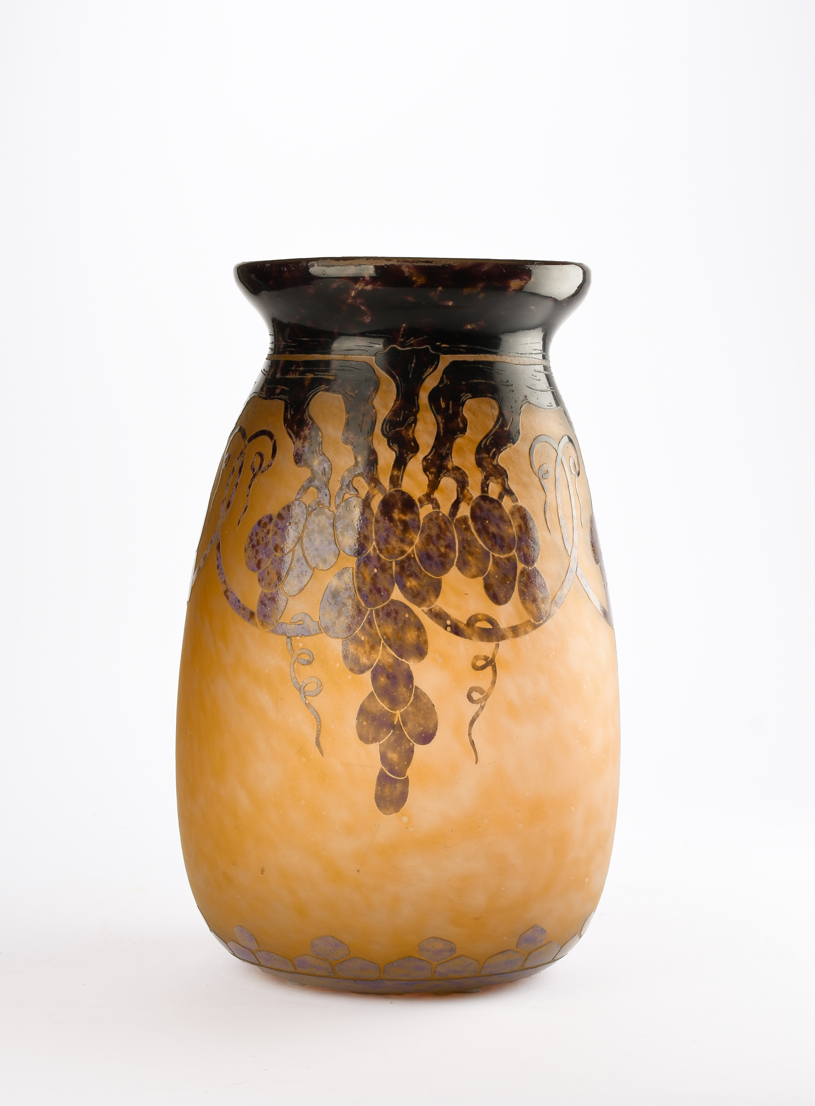 cameo glass in orange and purple, decorated with fruiting grape vine pattern