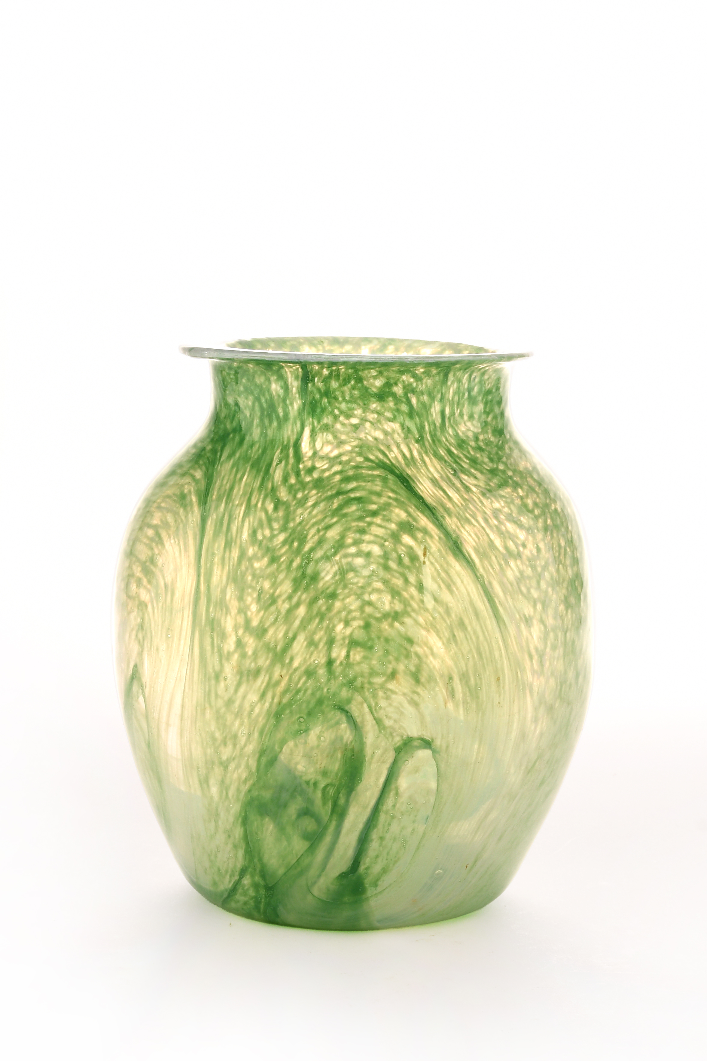 the first in a mottle jade green, the second of spherical form with coral red swirled pattern