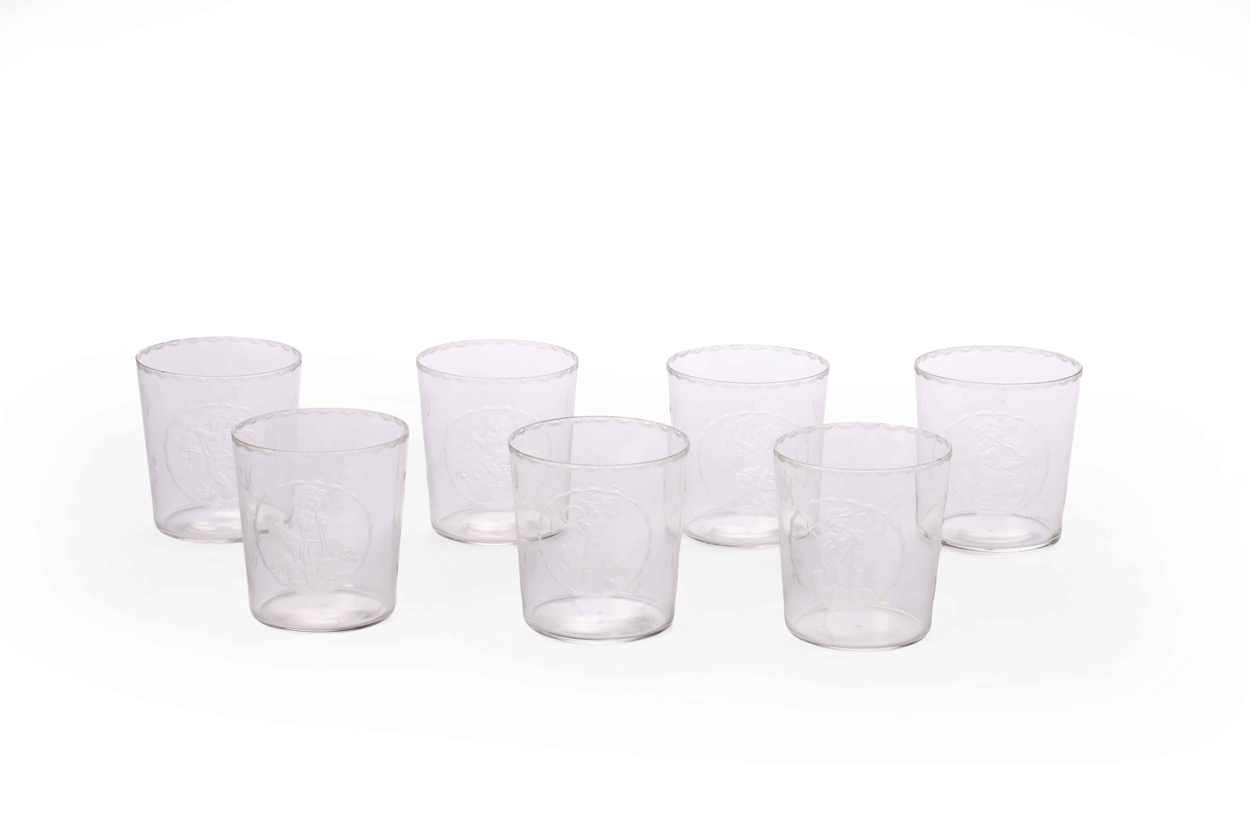 flaring cylindrical form, engraved with a roundel depicting a young child, four playing musical instruments, one sitting in a display of flowers, one with a sheep, the reverse engraved with simple flower stems,