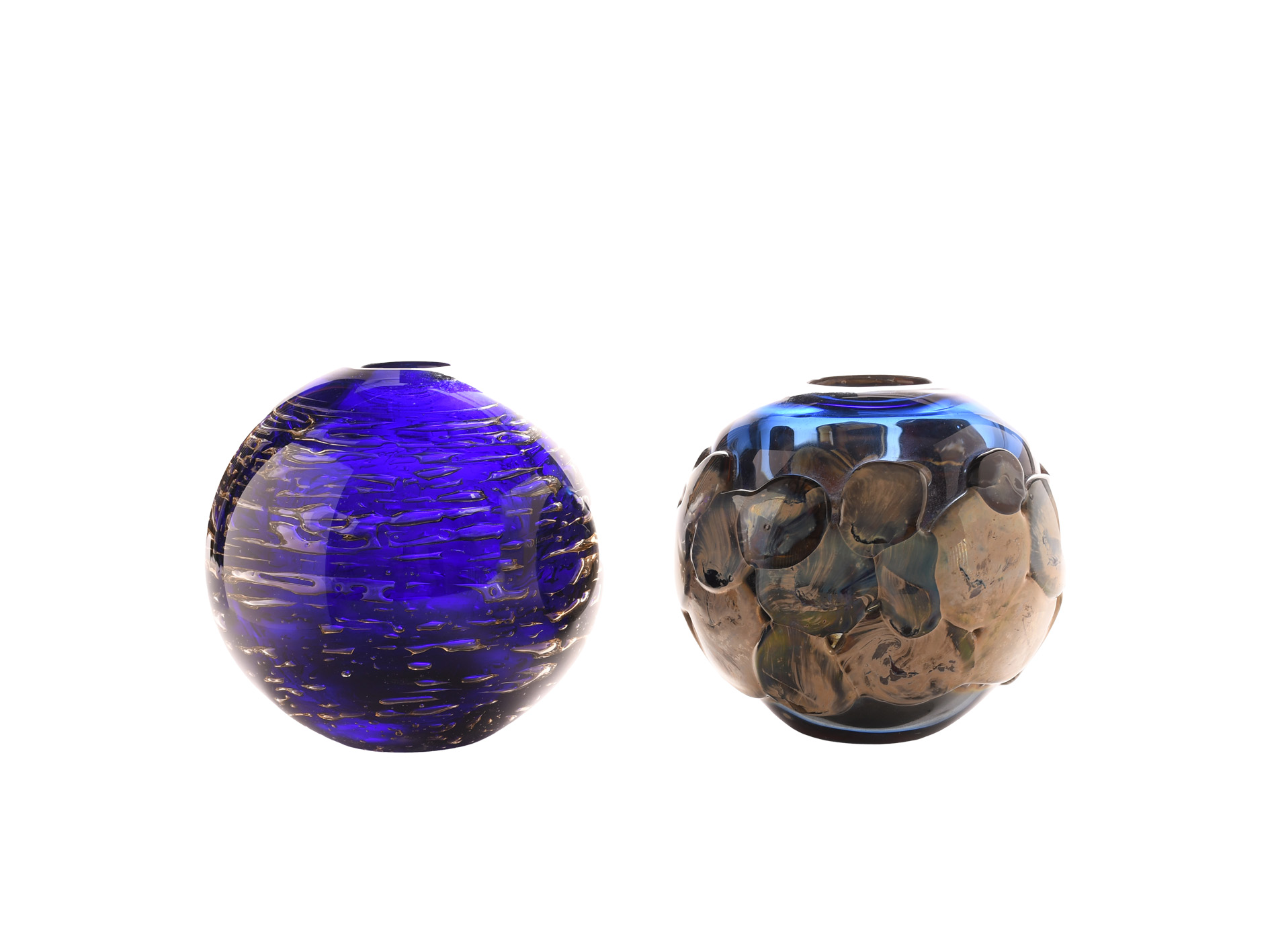 manufactured by Skrdlovice, pattern no. 8032, clear glass graduating to blue neck, with applied surface decorated petrol iridescent panels, and an internally decorated vase by Frantisek Vizner