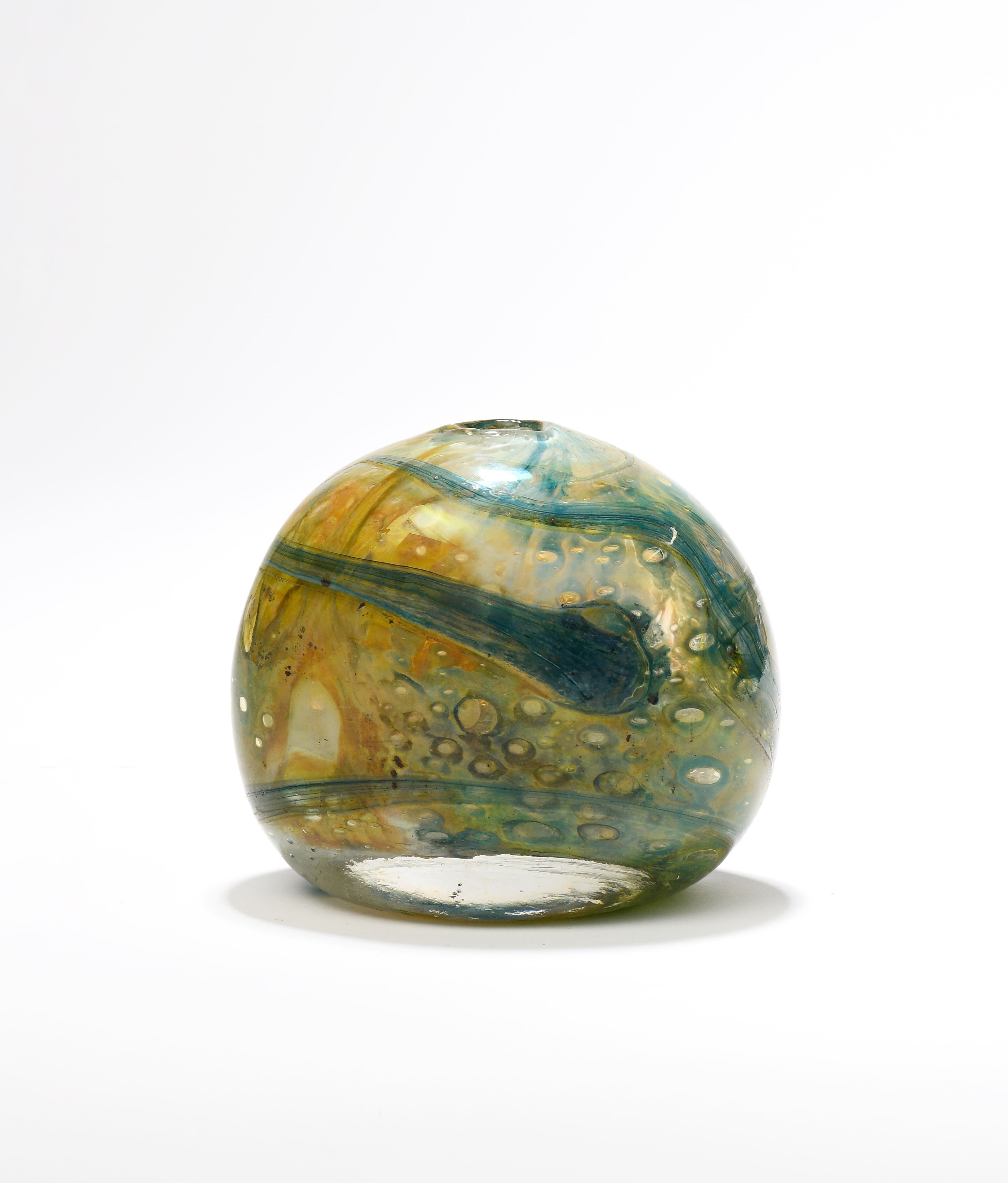 of globular form, with ochre and white inclusions cased in blue and green swirls