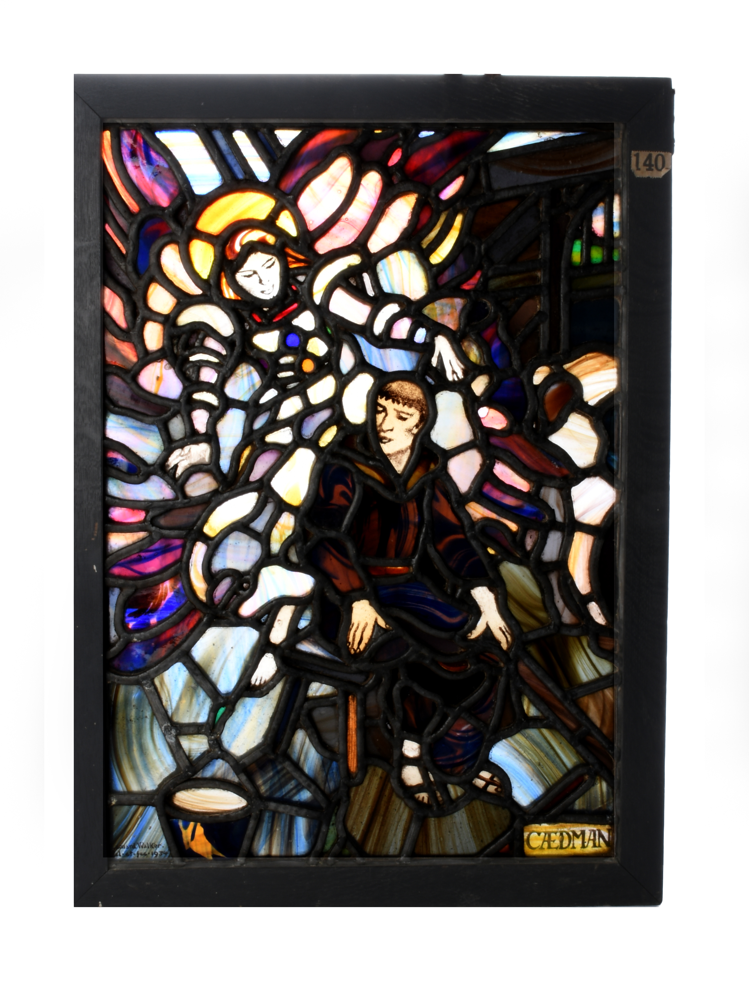 A rare Arts & Crafts stained glass panel titled Cædman,1934