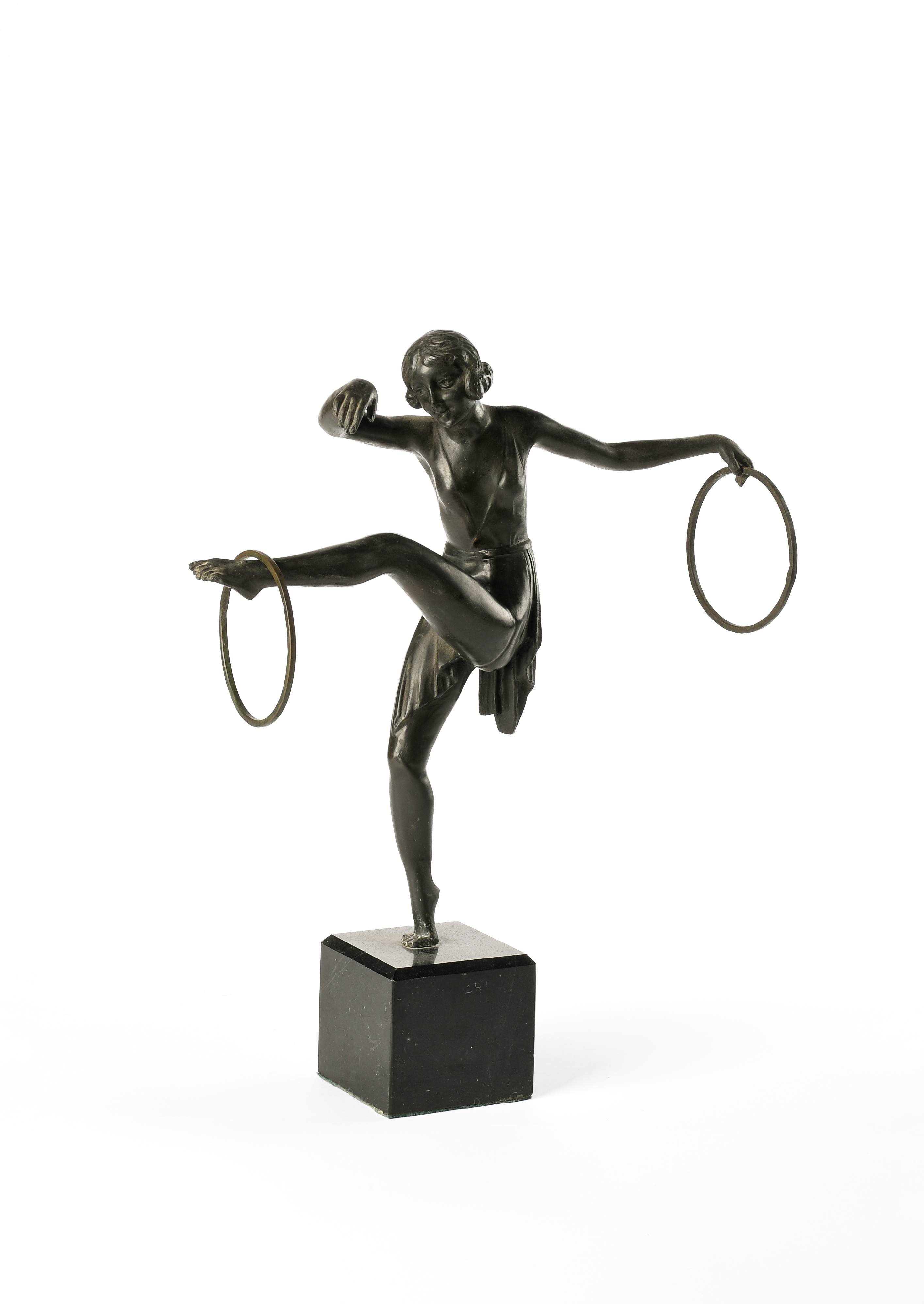 a patinated metal sculpture, modelled as a dancer, balancing on one foot, holding two hoop rings, on polished black marble base