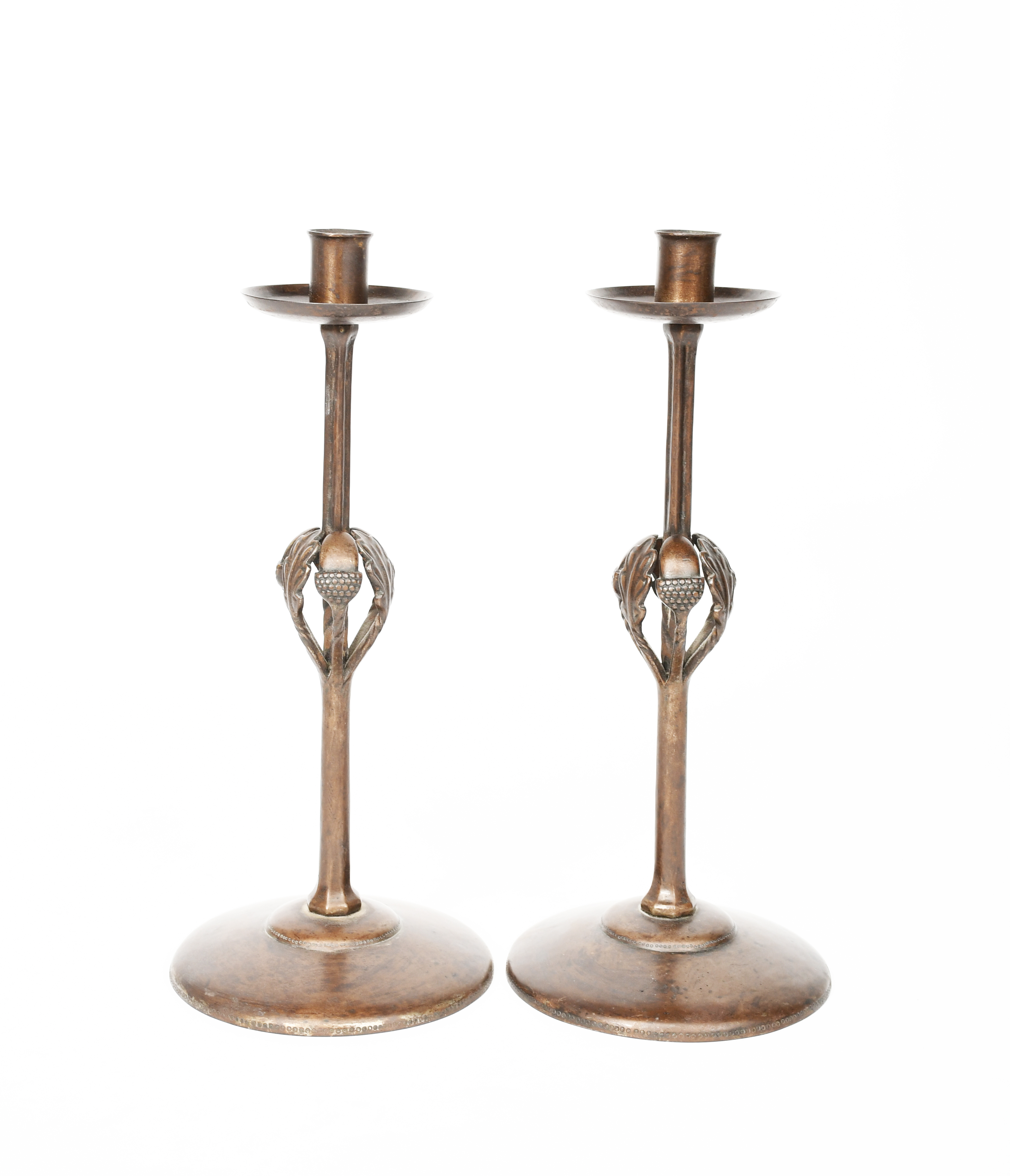 domed base with thin bands of punched decoration, the tapering stem with acorn and oak leaf knop,