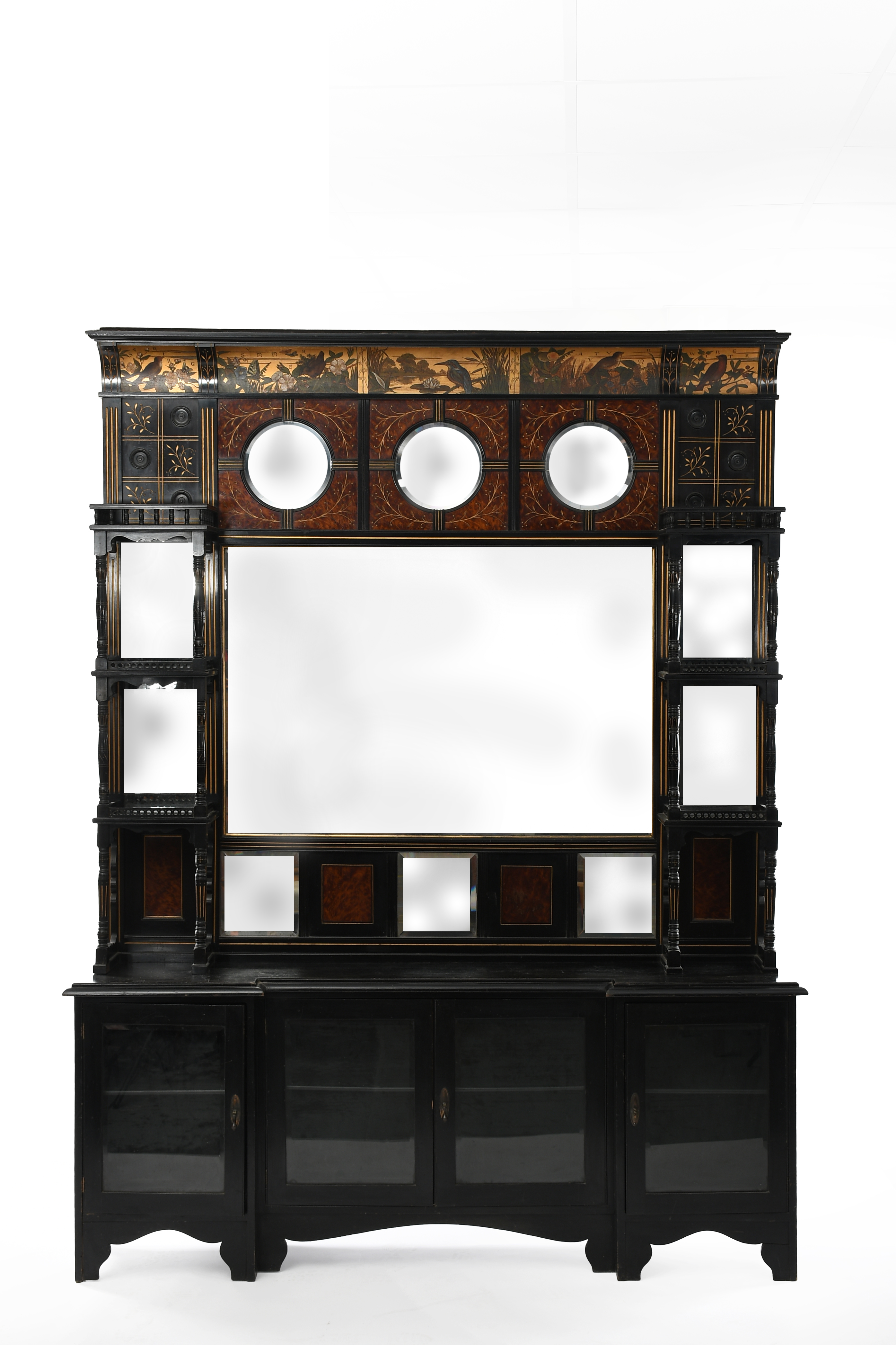 ebonised wood with parcel-gilt and polychrome painted decorations, the upper gallery with central mirror surrounded by smaller