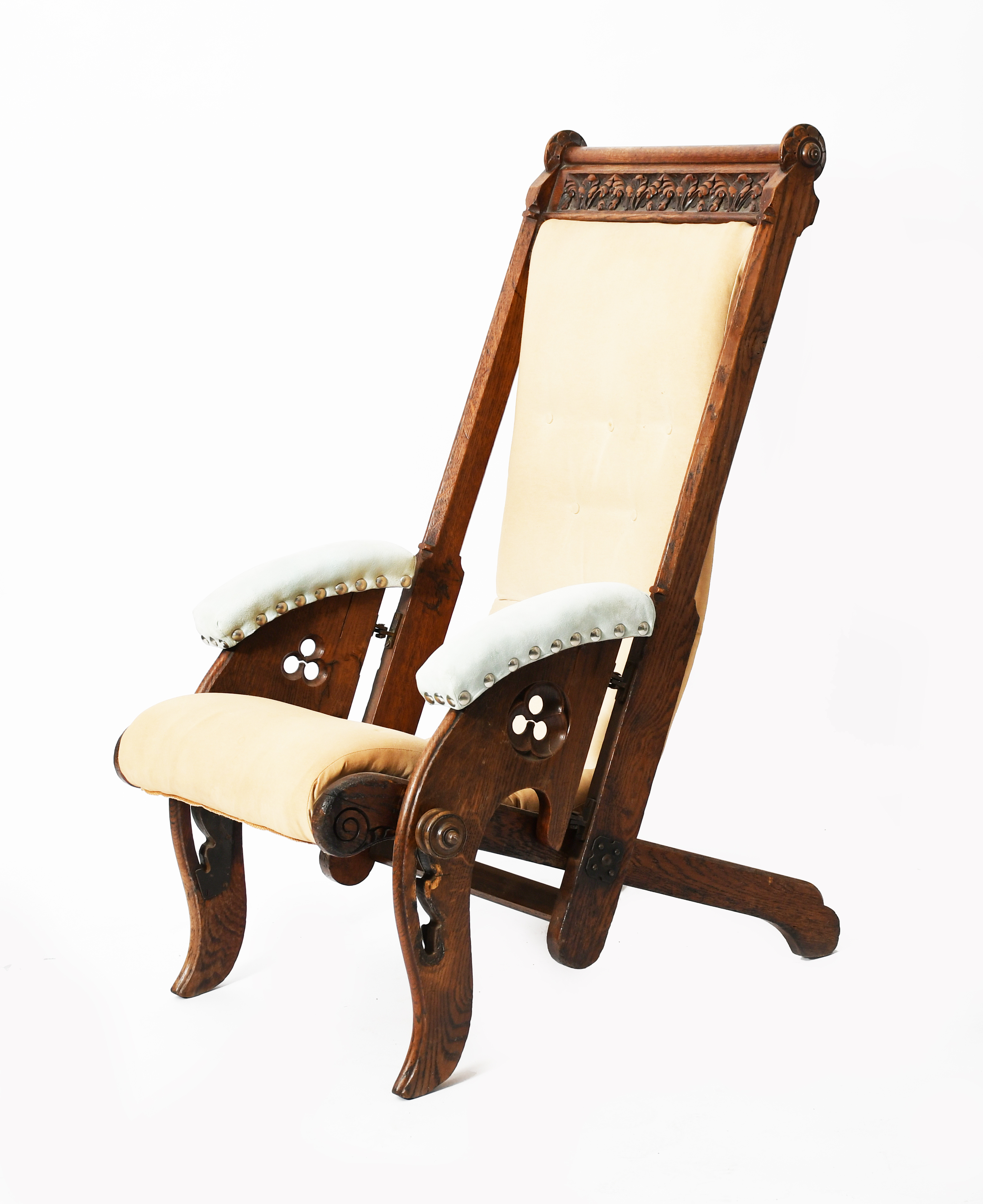 with carved tracery panels and foliate rail, slung seat and padded arms