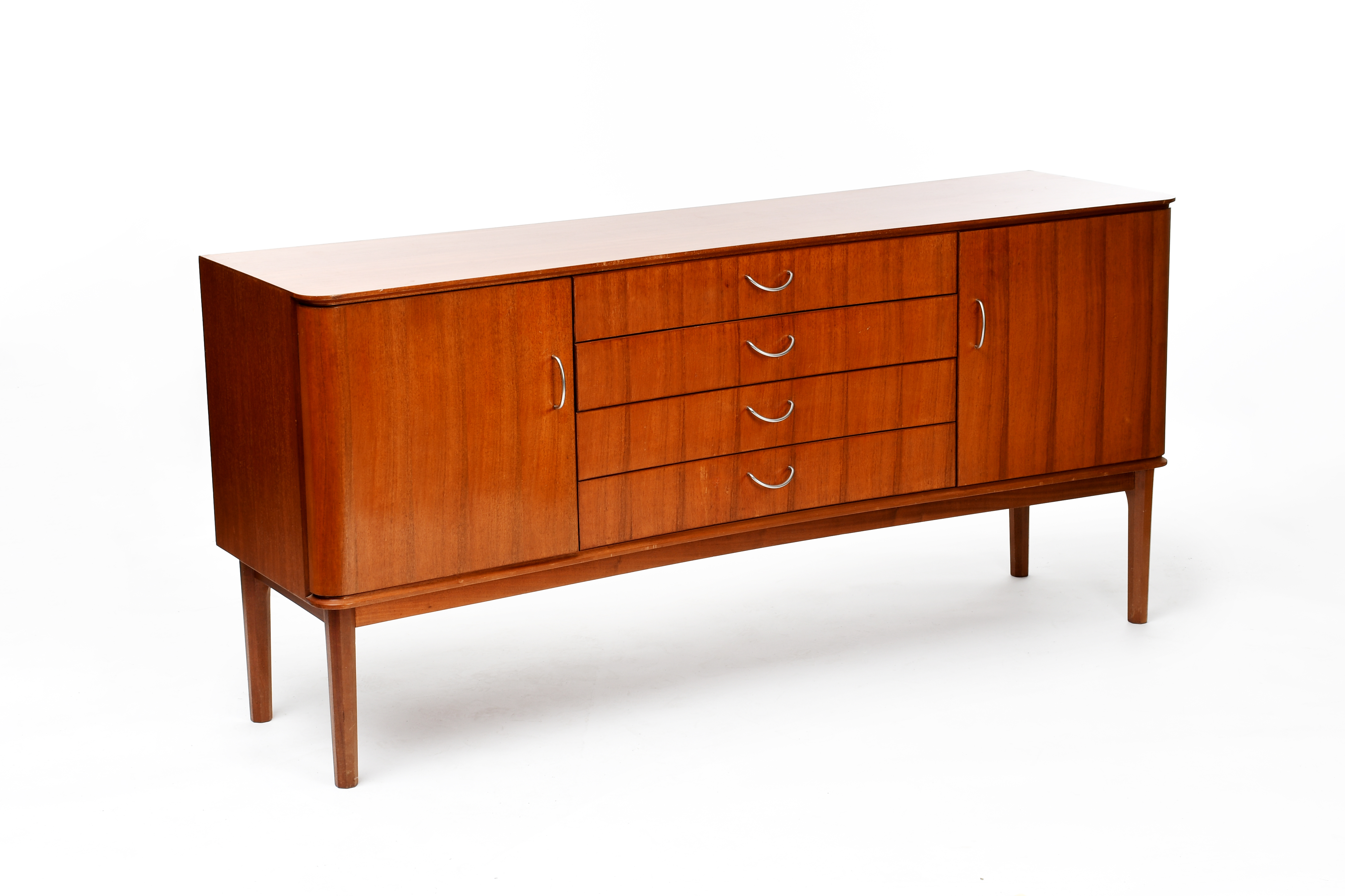mahogany and Indian Rosewood, the curved front with four drawers flanked by cupboard sections