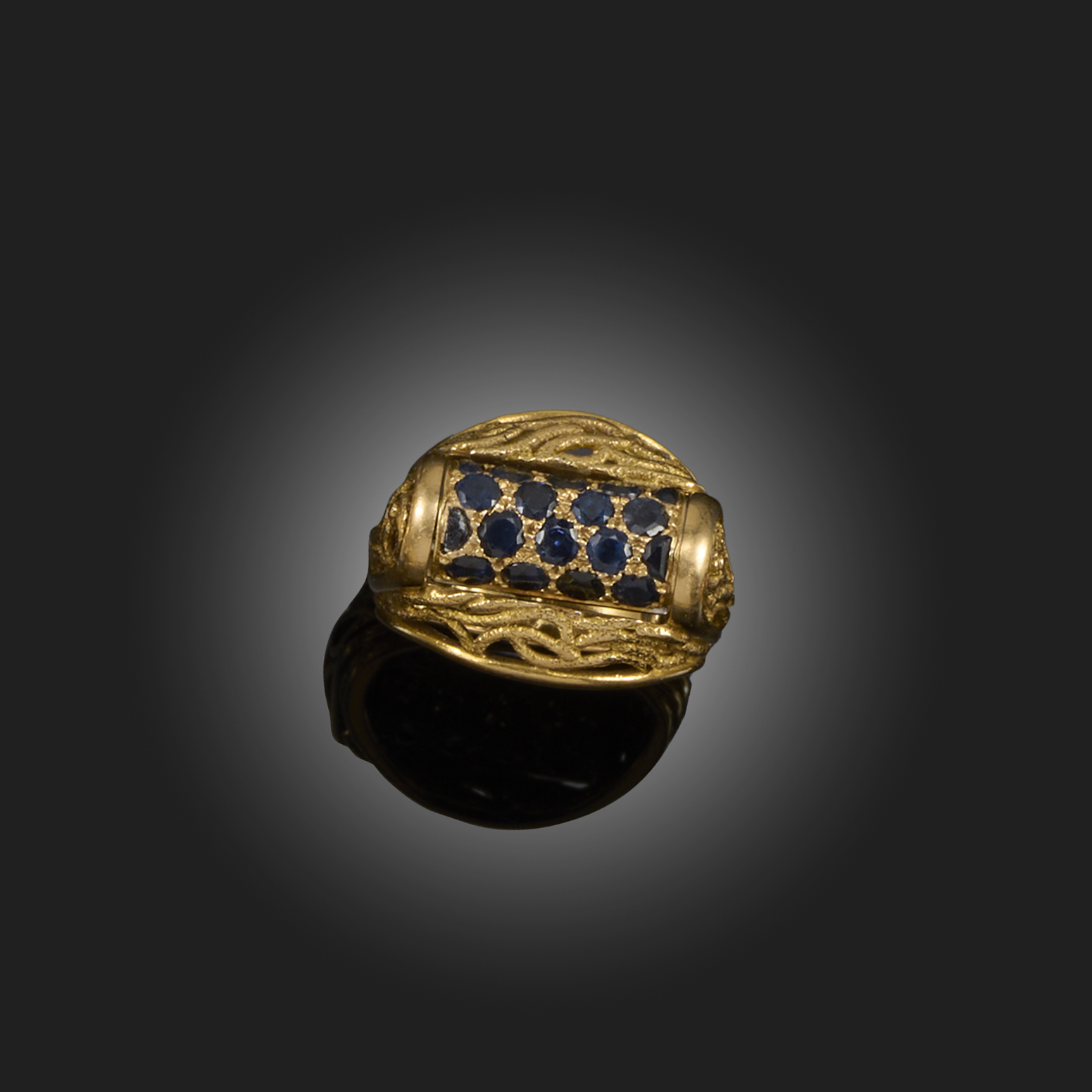 A SAPPHIRE AND DIAMOND DRESS RING, of swivel design centred with a revolving cylinder pavé-set with circular-cut sapphires to one half and round brilliant-cut diamonds to the other, all within a pierced high surround decorated with scrolling motifs, in yellow gold, French control mark, size L 1/2, case