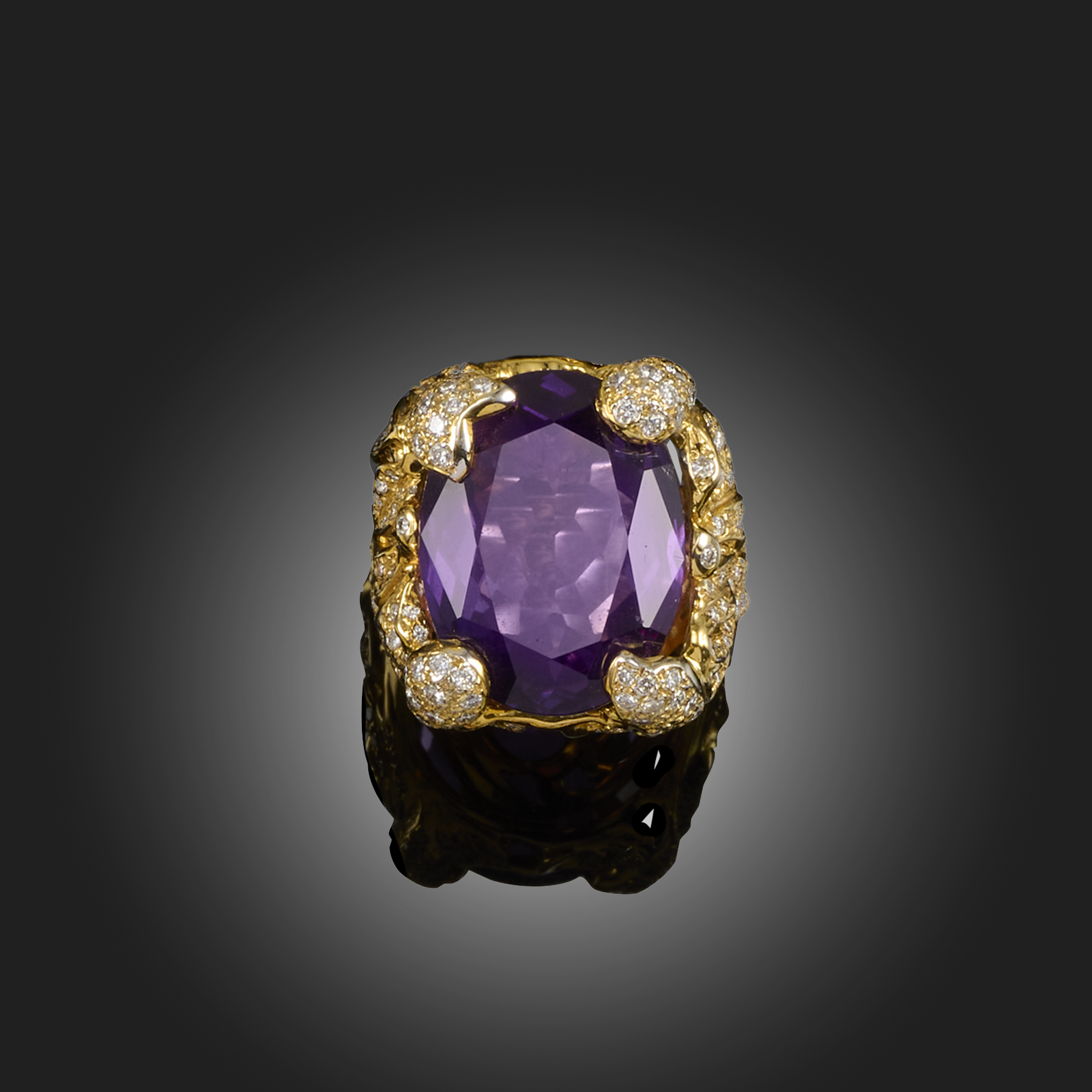 AN AMETHYST AND DIAMOND DRESS RING, the oval-shaped amethyst set with broad organic-shaped claws pavé-set with diamonds, above a high surround of openwork foliate design set with diamonds, mounted in gold, size N 1/2, 26g