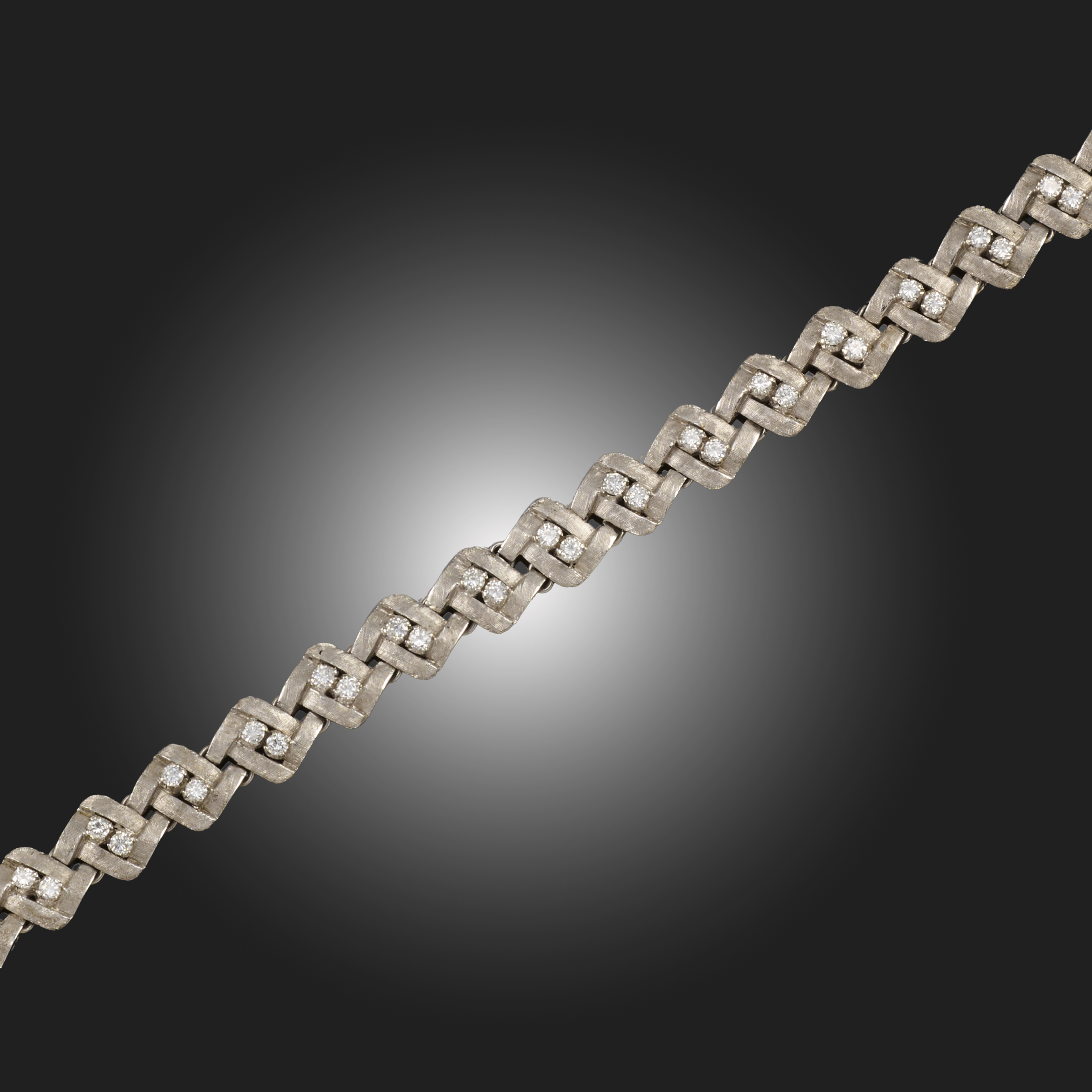 A DIAMOND-SET WHITE GOLD BRACELET, composed of textured white gold links of crossover design, each set with two round brilliant-cut diamonds, stamped 18ct 750, length 17.3cm, gross weight 24g