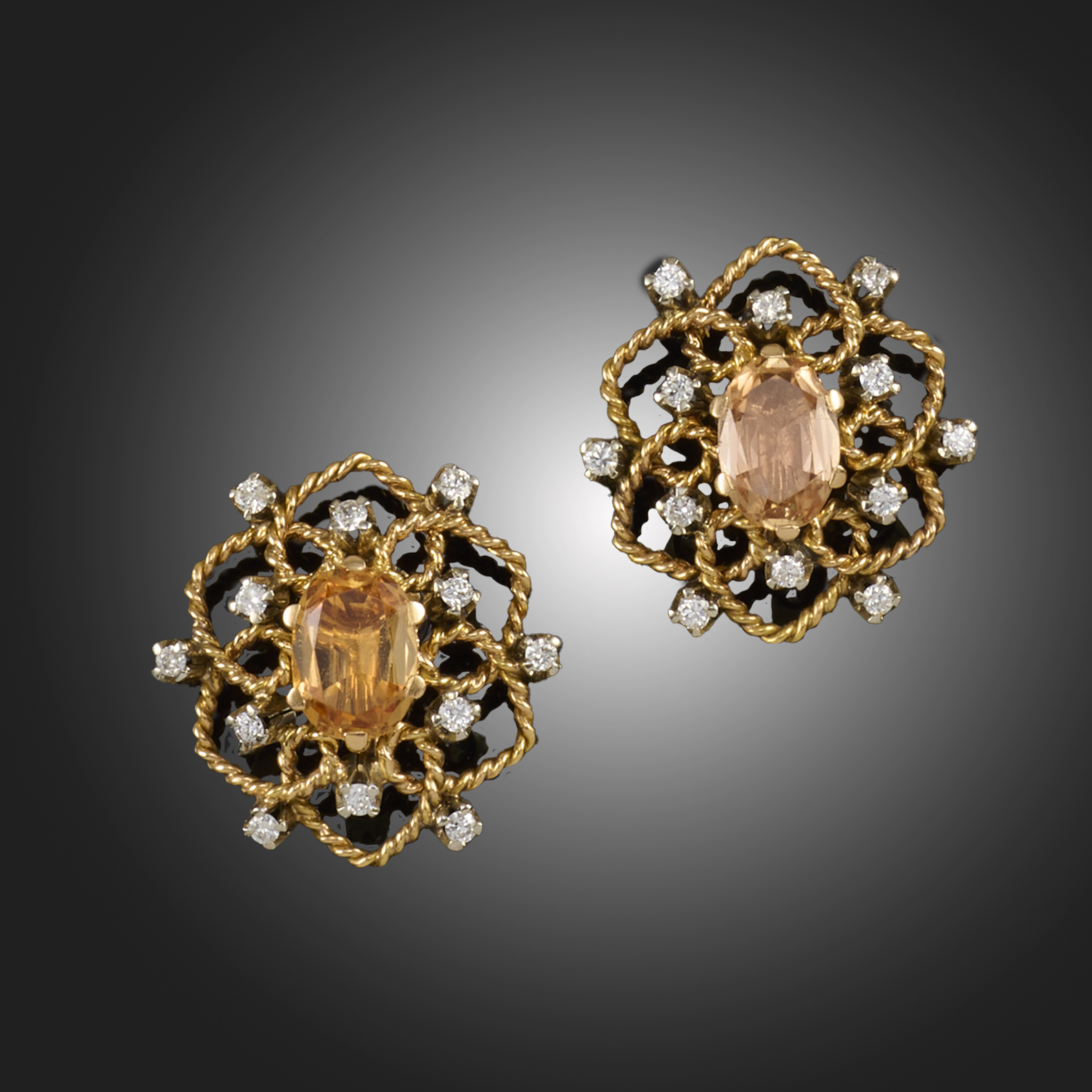 A PAIR OF TOPAZ AND DIAMOND EARRINGS, each centred with a oval-shaped yellow topaz within an openwork ropetwist border set with round brilliant-cut diamonds, in white and yellow gold, screw fittings, width 2.4cm