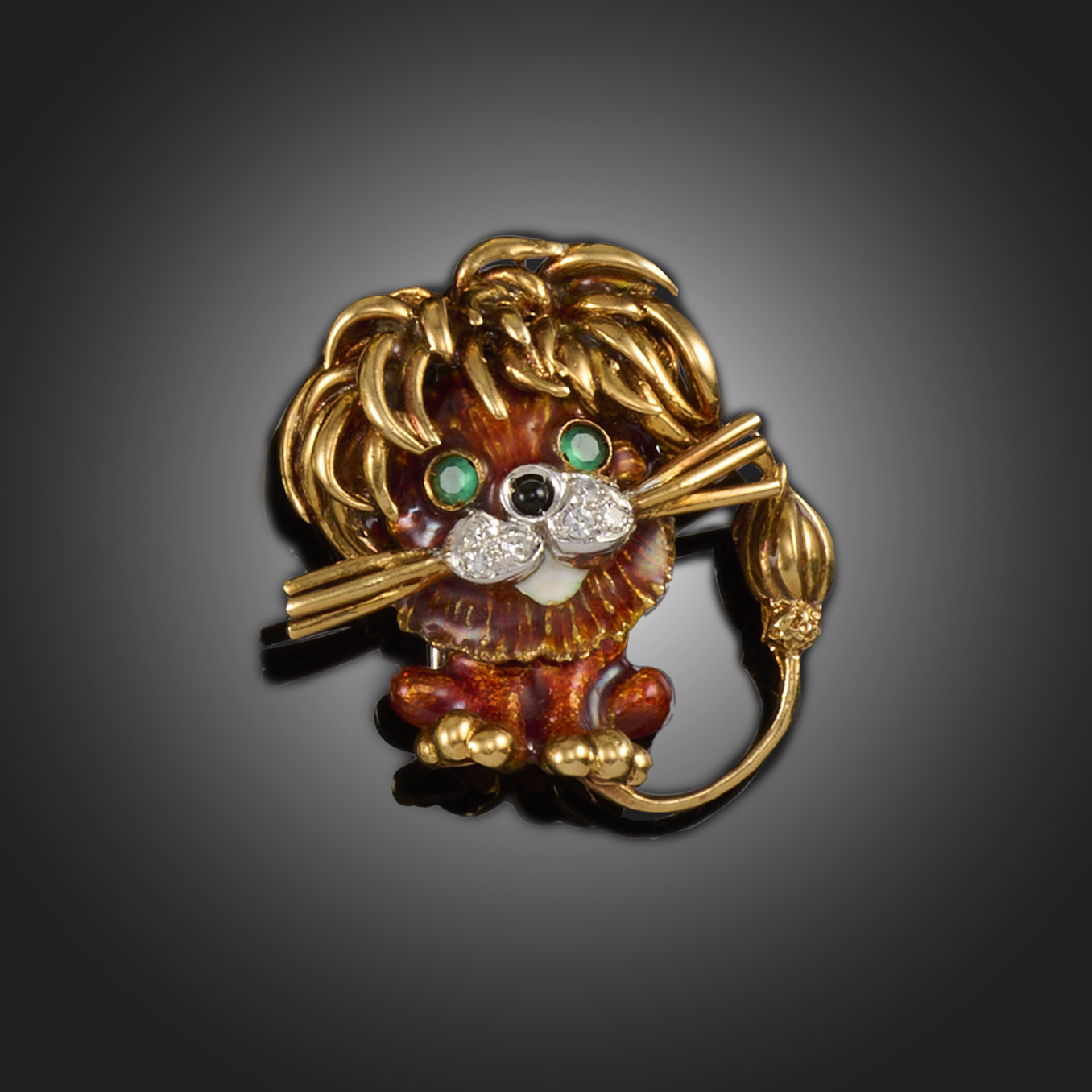 FRASCAROLO, AN EMERALD, DIAMOND AND ENAMEL BROOCH, designed as a seated lion, with emerald-set eyes, its mouth pavé-set with diamonds, detailed with ochre and black enamel, in gold, initals FC for Frascarolo, stamped Modele Deposé 750/18K Made in Italy, height 2.8cm, gross weight 15g