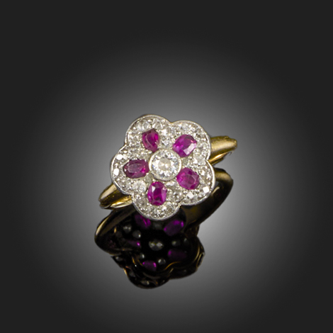 A RUBY AND DIAMOND FLOWERHEAD RING