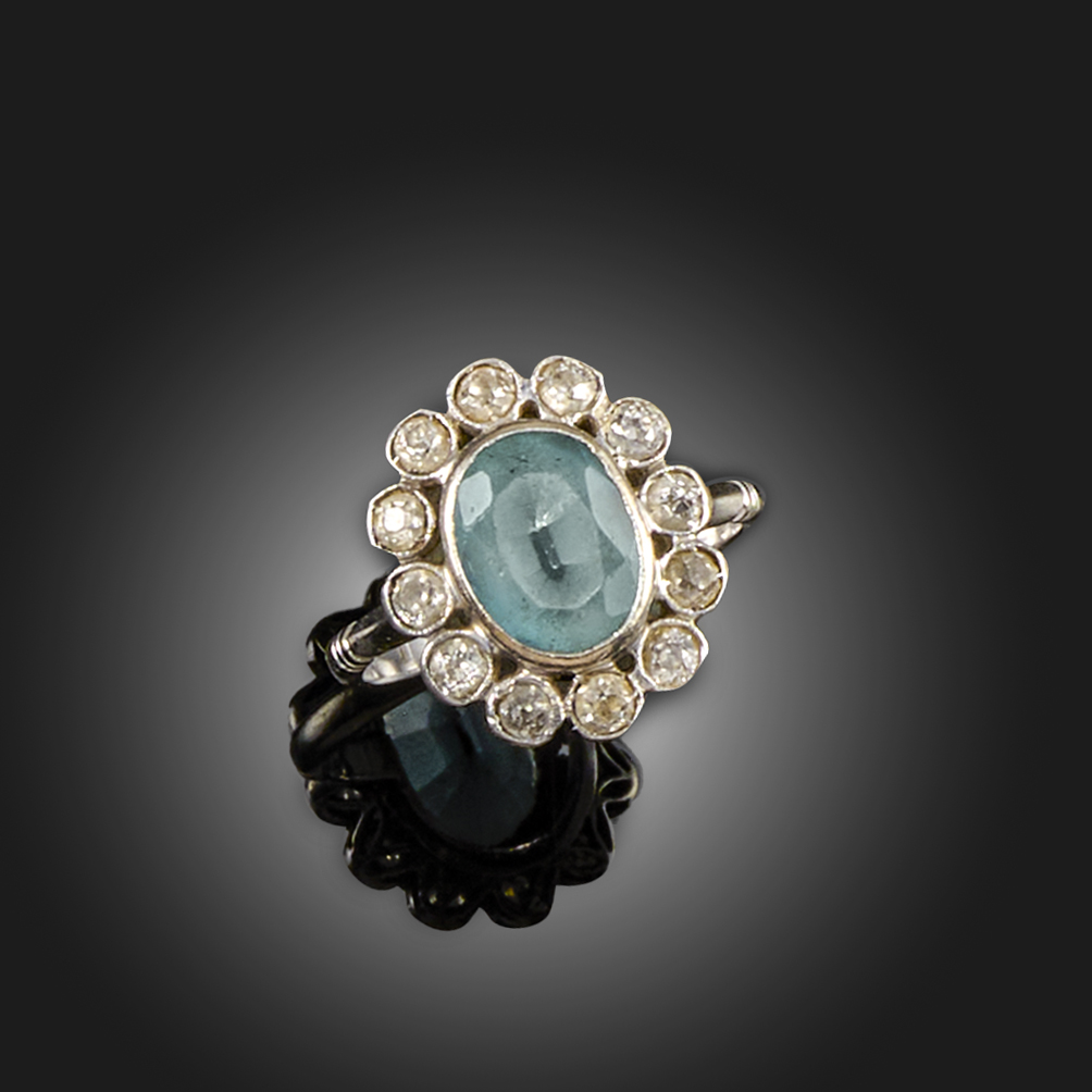 AN AQUAMARINE AND DIAMOND CLUSTER RING