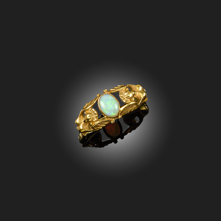 AN ART NOUVEAU OPAL RING, set with an oval opal cabochon between elaborate pierced shoulders each modelled as the figure of a winged harpy, in yellow gold, gross weight 5g, case size Q 1/2