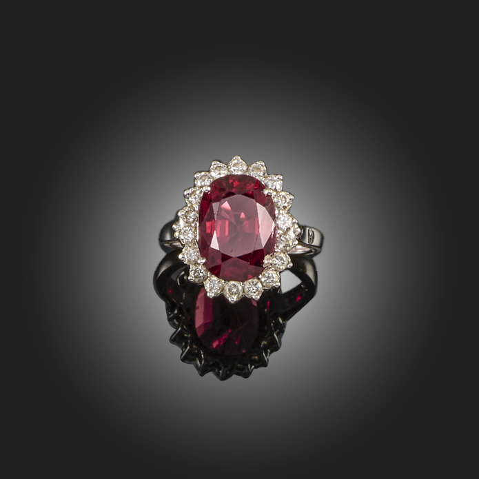 A SPINEL AND DIAMOND CLUSTER RING, set with an oval-shaped spinel weighing approximately 5.90cts, within a surround of round brilliant-cut diamonds in white gold, size K 1/2
