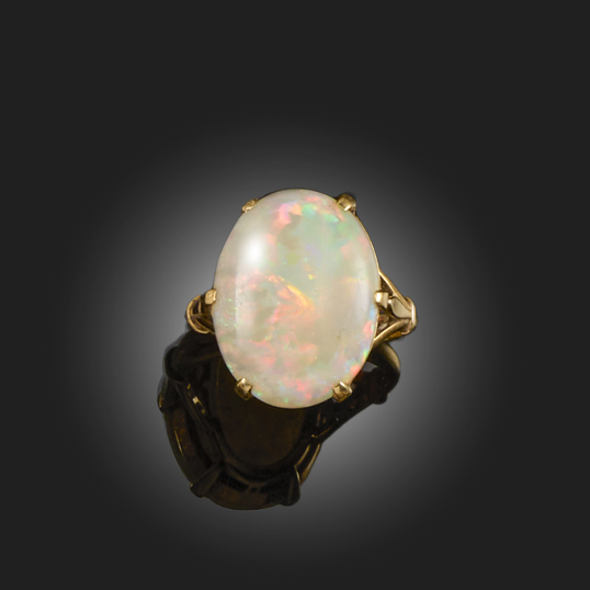 AN OPAL SOLITAIRE RING, set with an oval opal cabochon, mounted in 18ct yellow gold, stamped 18ct, size I 1/2