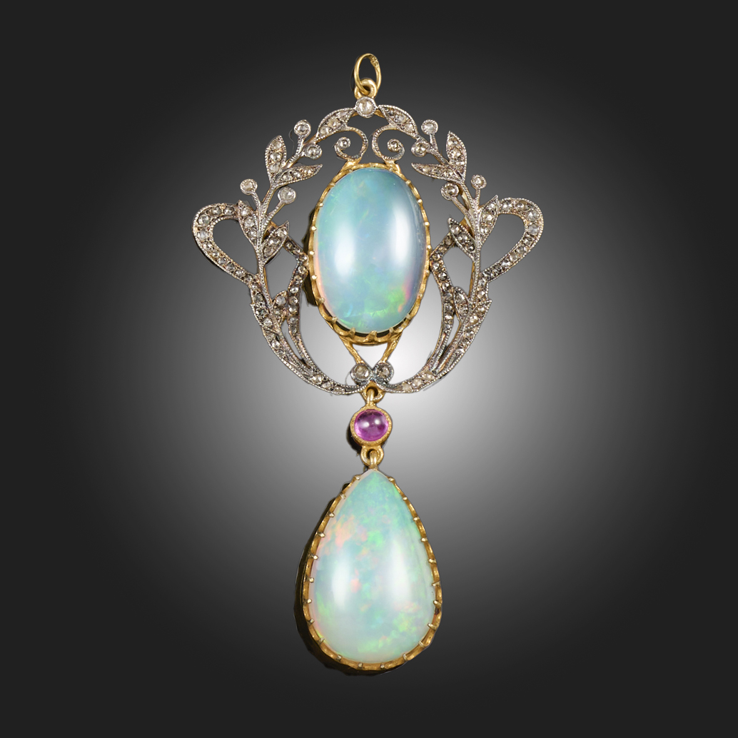 AN OPAL, PINK SAPPHIRE AND DIAMOND PENDANT