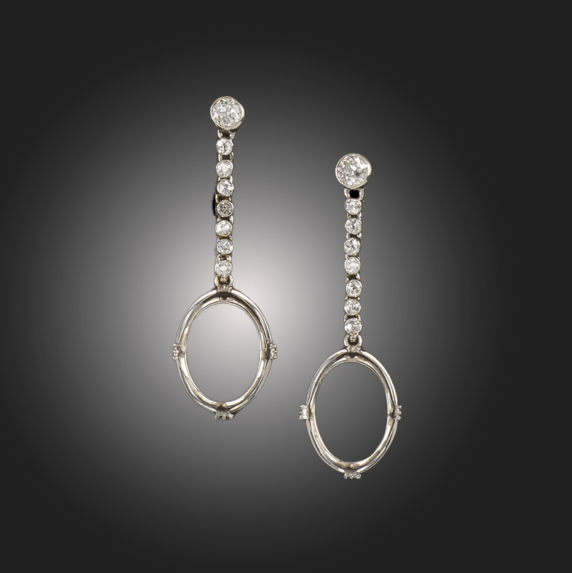 A PAIR OF DIAMOND EARRING MOUNTS, each set with a row of graduated old circular-cut diamonds in collet settings suspending an oval-shaped vacant setting, in platinum, length 3.6cm