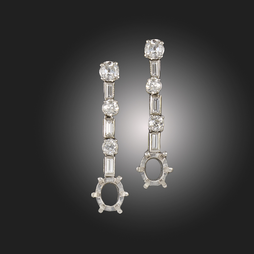 A PAIR OF DIAMOND EARRING MOUNTS, each designed as a drop composed of alternating old circular-cut and baguette-shaped diamonds suspending a vacant setting, in platinum, post fittings, length 4cm
