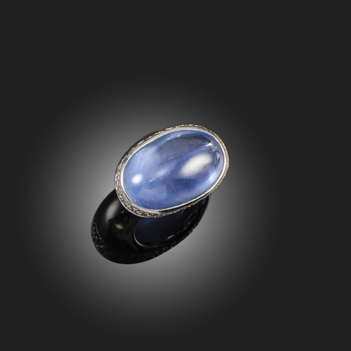 CARLO LUCA DELLA QUERCIA, A SAPPHIRE AND DIAMOND RING, set with an oval cabochon sapphire measuring 19.5 x 12.5 x 8.6mm, within a high surround set with round brilliant-cut diamonds, mounted in white gold, Italian control mark for Carlo Luca della Quercia Srl, stamped 750, size G, gross weight 13g
