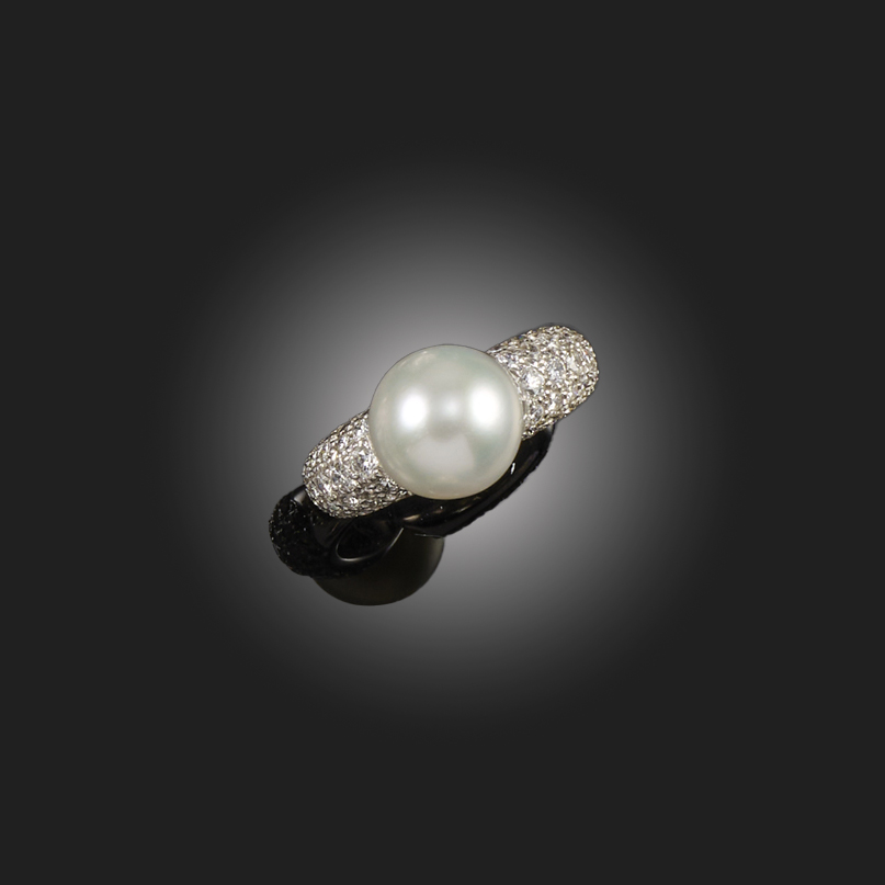 A CULTURED PEARL AND DIAMOND RING, set with a cultured pearl measuring approximately 11.6-11.8mm, to shoulders pavé-set with graduated round brilliant-cut diamonds, in white gold, stamped 18ct, size N 1/2