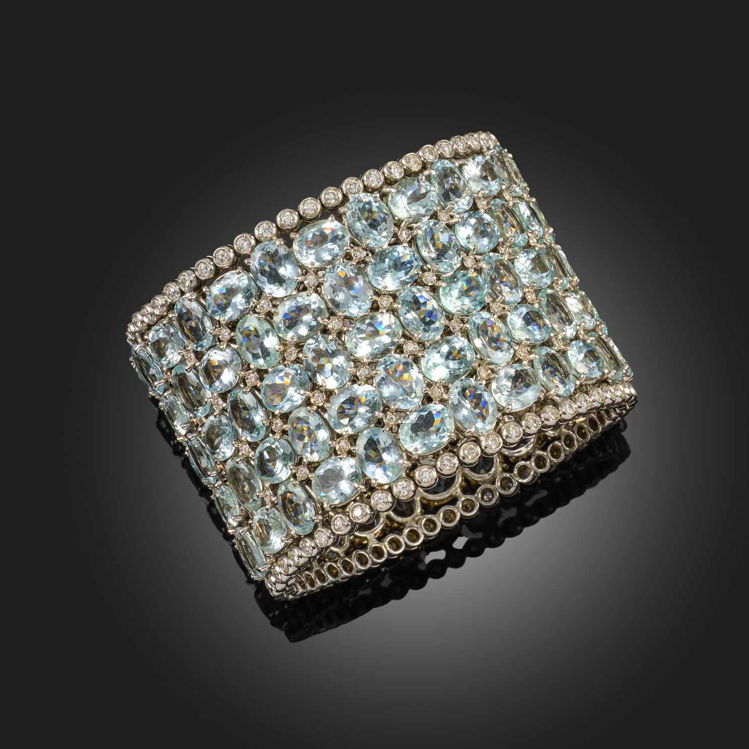 AN AQUAMARINE AND DIAMOND BANGLE, of hinged design, set with an openwork design of oval-shaped aquamarines and round brilliant-cut diamonds, within borders of collet-set round brilliant-cut diamonds in white gold, stamped 750, inner circumference 18cm