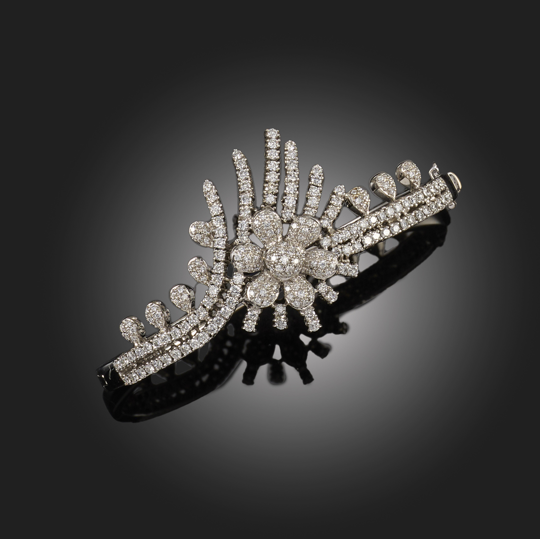 A DIAMOND AND 18CT GOLD BANGLE, of hinged design, centring on a floral crossover motif set with round brilliant-cut diamonds, mounted in 18ct white gold, London hallmarks for 2003, inner circumference 17.5cm, gross weight 31g
