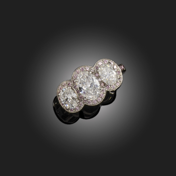 A DIAMOND THREE STONE RING, CIRCA 2007, set with three graduated oval-shaped diamonds weighing approximately 0.60, 1.00 and 0.55cts, within a surround of pink diamonds in platinum, London hallmarks for 2007, size M