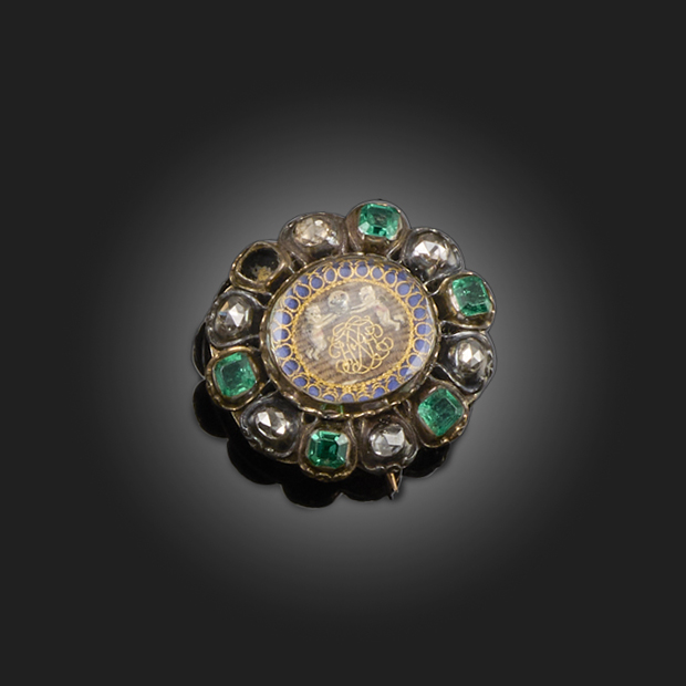 A 17TH CENTURY STUART CRYSTAL, EMERALD AND DIAMOND SLIDE, the stuart crystal set above a woven gold cypher and two putti holding a skull over woven hair, within a border of emeralds and diamonds in closed back silver and gold setting, later brooch fitting adapted from a slide, engraving for Frances Hackett to reverse, length 2.2cm