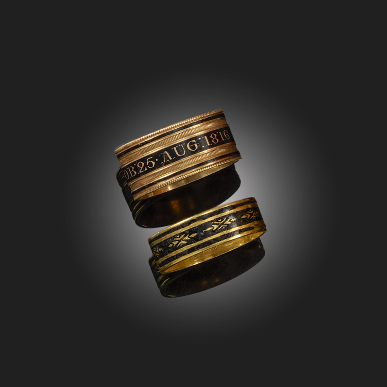 TWO GEORGE III MOURNING RINGS, comprising: a mourning ring with a central black enamel band inscribed in reserve 'Willm Davies Ob 25 Aug 1816 Æ 71' between reeded borders and plain black enamel bands within ropetwist edges, maker's mark JBWW, British hallmarks, size O; and a mourning ring with a three black enamel bands, the central band decorated in reserve with a geometric pattern, inscribed to the interior 'Sarah White Ob 19 Jan 1792 Aet 88', maker's mark RS, British hallmarks, size O, enamel chipped