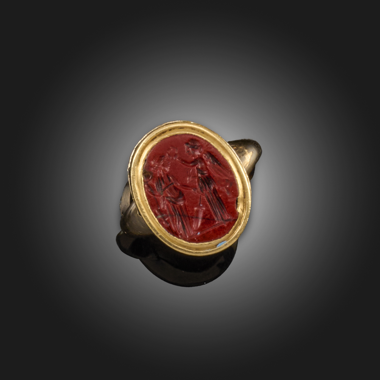 A ROMAN JASPER INTAGLIO, 2ND CENTURY AD, depicting Fortuna crowned by Victory, within a gold border with a later gold shank, intaglio 15.47 x 12.27 x 2.86mm, shank size T 1/2, intaglio detached from shank