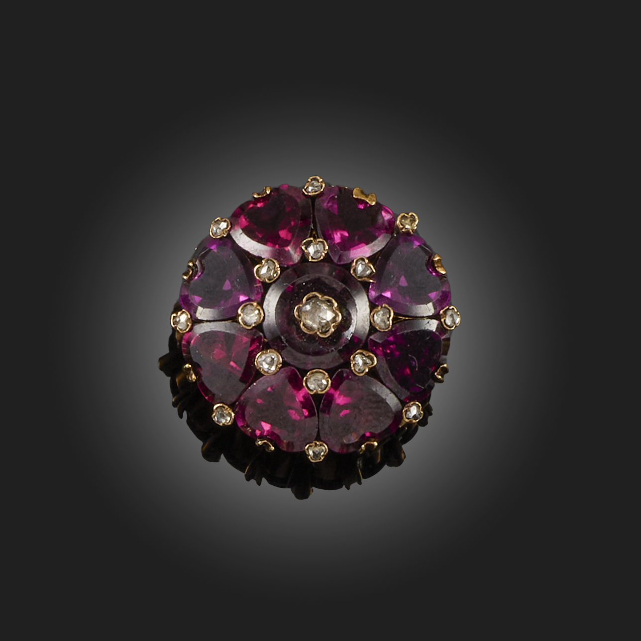 A FRENCH GARNET AND DIAMOND BROOCH, set with a circular-cut garnet to the centre, mounted with a collet-set rose-cut diamond, within a circular border of heart-shaped garnets spaced with collet-set rose-cut diamonds, in yellow gold, with French control marks, width 2.4cm