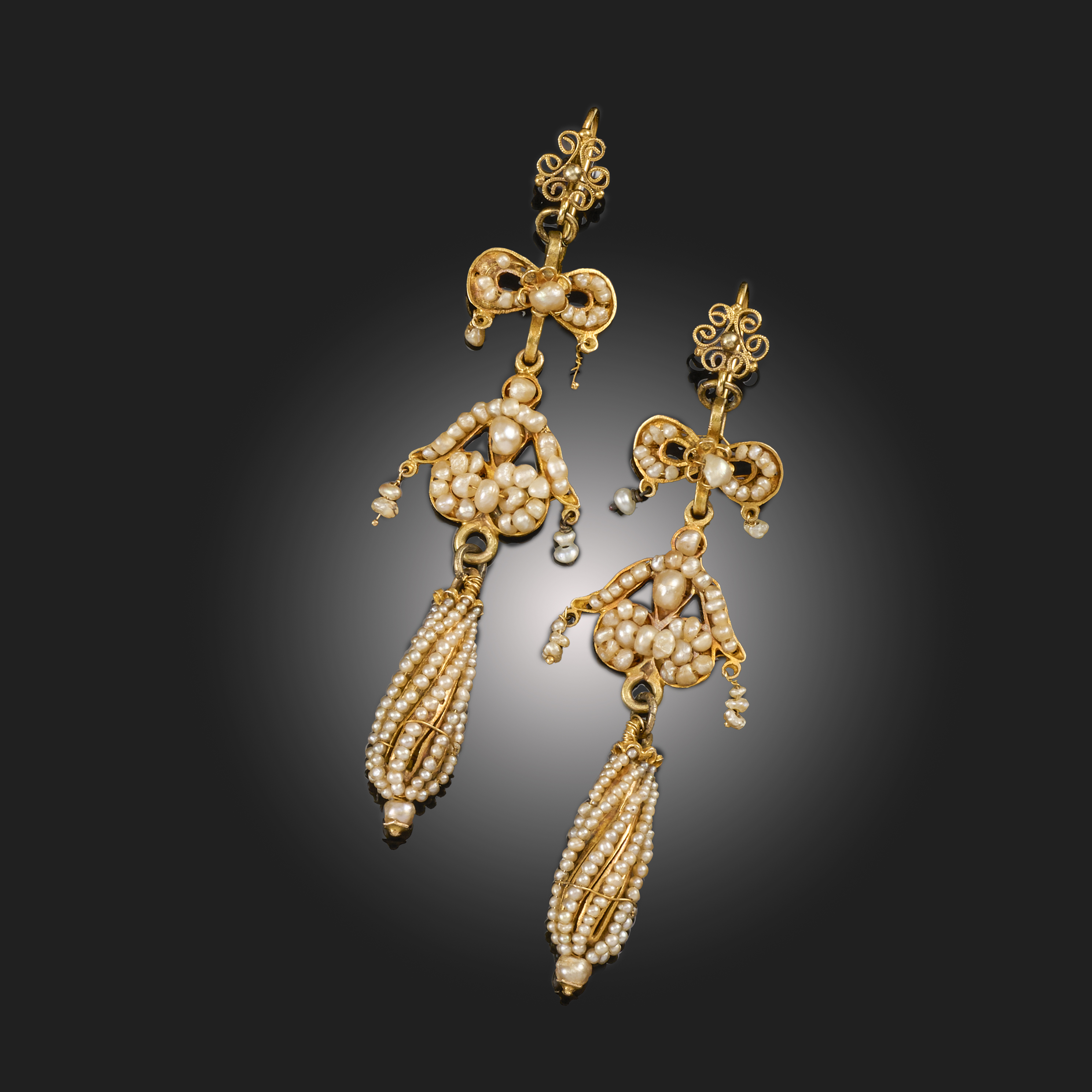 A PAIR OF GOLD AND SEED PEARL DROP EARRINGS, SOUTHERN ITALY, EARLY-MID 19TH CENTURY, each composed of three sections, with a stylised ribbon-tie motif above a scrolling link suspending a wrythen drop, all in gold and decorated with seed pearls, later hook fittings, length 9cm, gross weight 17g, case
