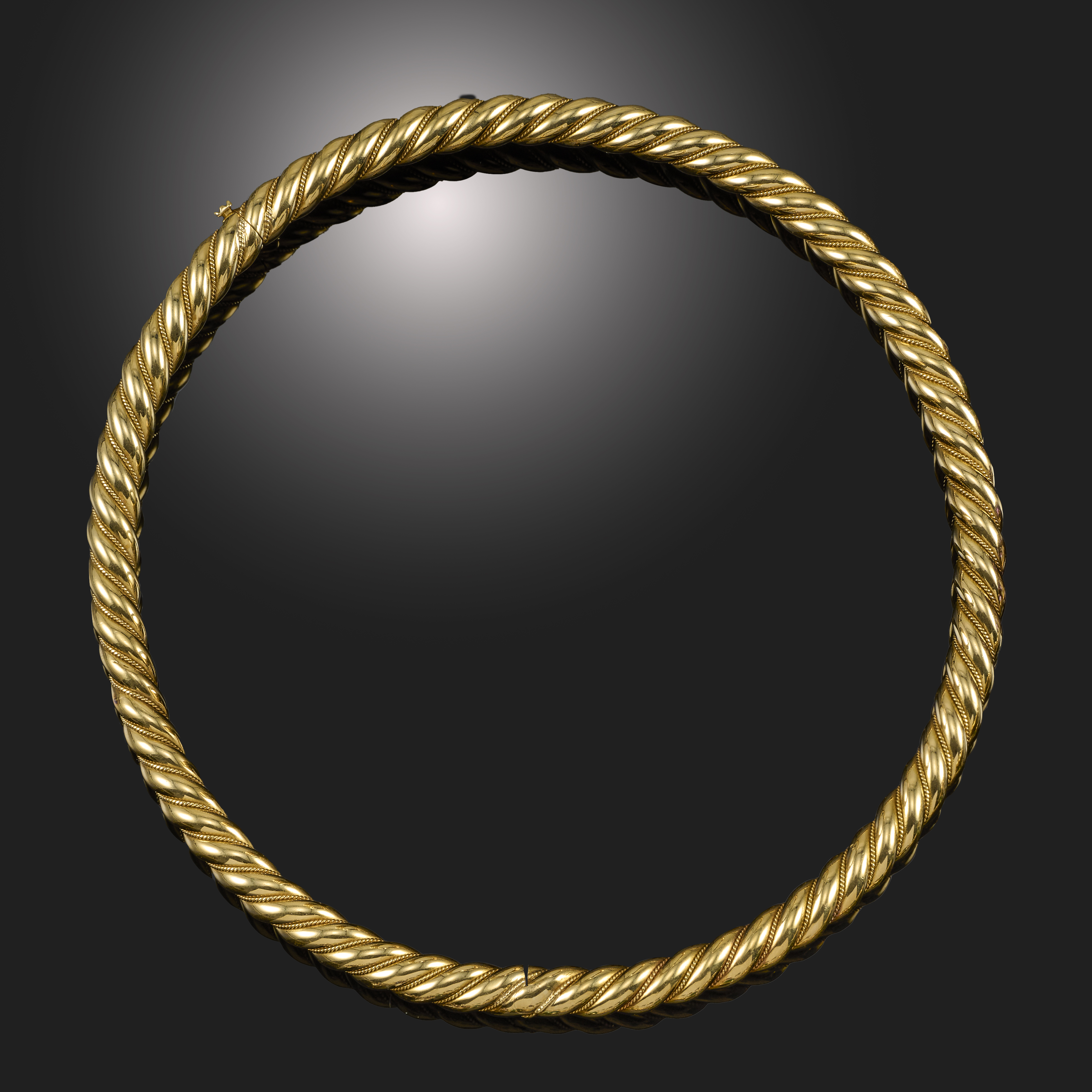 A GOLD TORQUE COLLAR NECKLACE, of hinged design, formed as a stylised ropetwist motif, in yellow gold, stamped 750, inner circumference 38.5cm, 65g