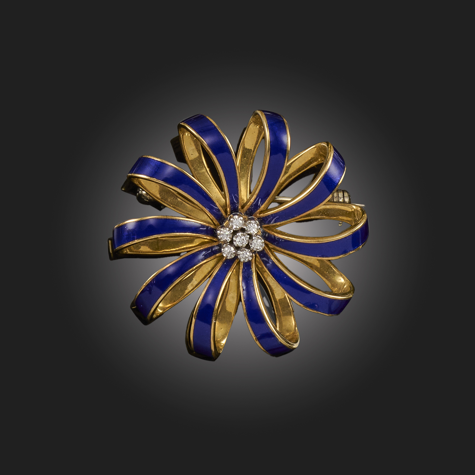 A DIAMOND AND ENAMEL BROOCH, set with a cluster of round brilliant-cut diamonds centring on a radiating openwork motif decorated with blue enamel, in yellow gold, Italian control mark, stamped 750, width 3.5cm, gross weight 13g