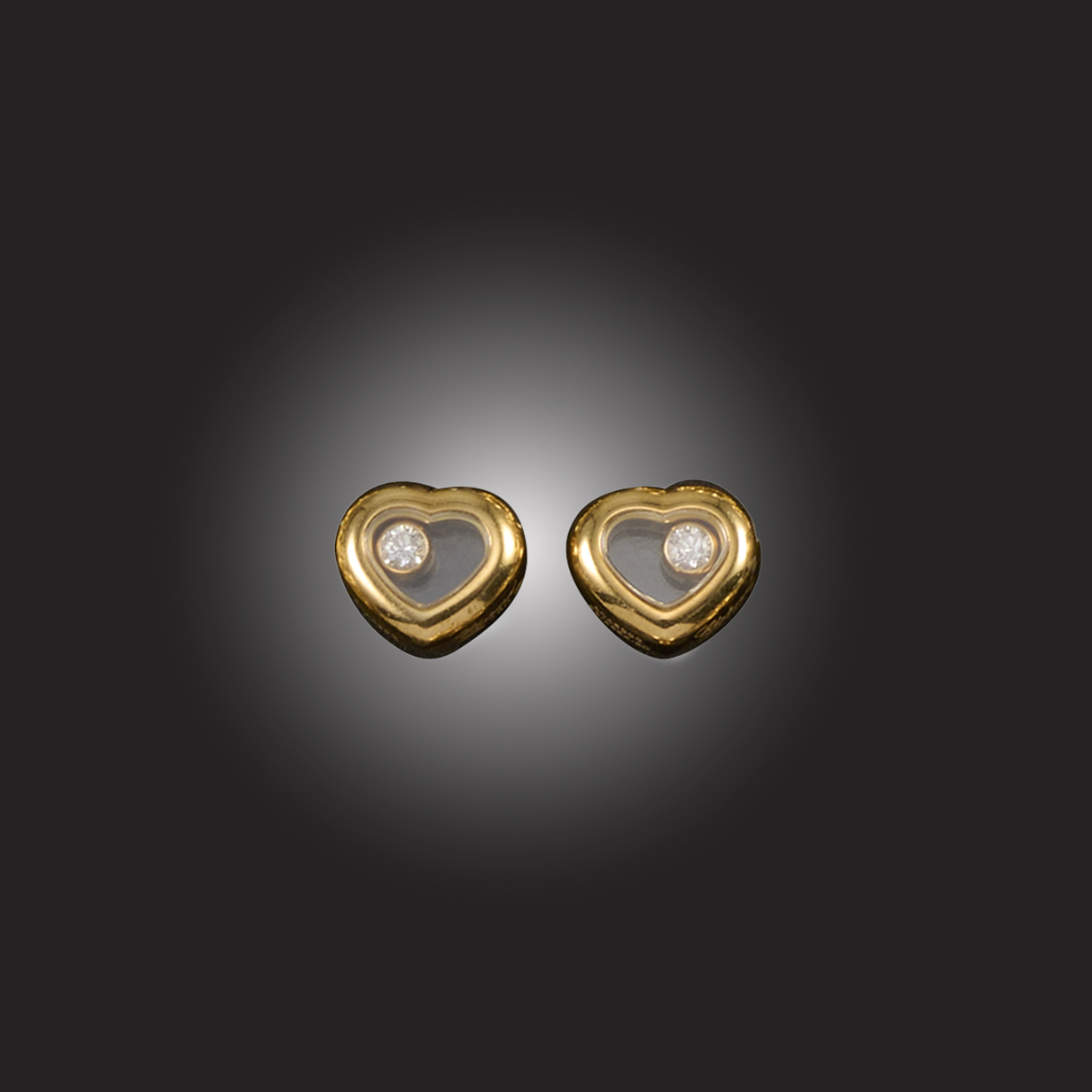 CHOPARD, A PAIR OF 'HAPPY DIAMOND' STUD EARRINGS, the heart-shaped gold frames with glazed compartments each enclosing a floating round brilliant-cut diamond in a gold collet, signed Chopard and numbered 6065299 83/4854-20, European convention mark for 18ct gold, post fittings, width 8mm, gross weight 4g