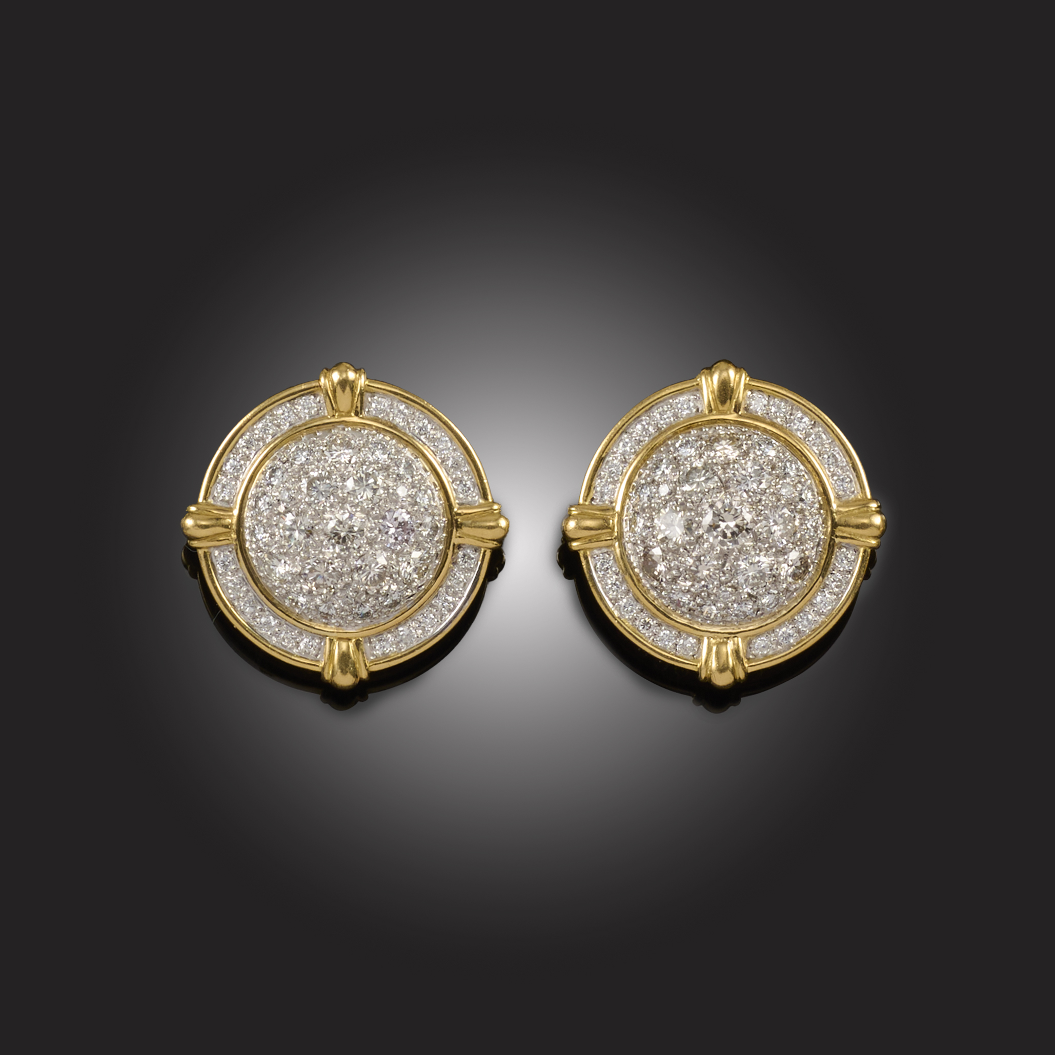 THEO FENNELL, A PAIR OF DIAMOND EARRINGS, of circular domed design, pavé-set with graduated round brilliant-cut diamonds in white gold, within diamond-set borders quartered with yellow gold lappets, signed Fennell, clip and post fittings, diameter 2.5cm