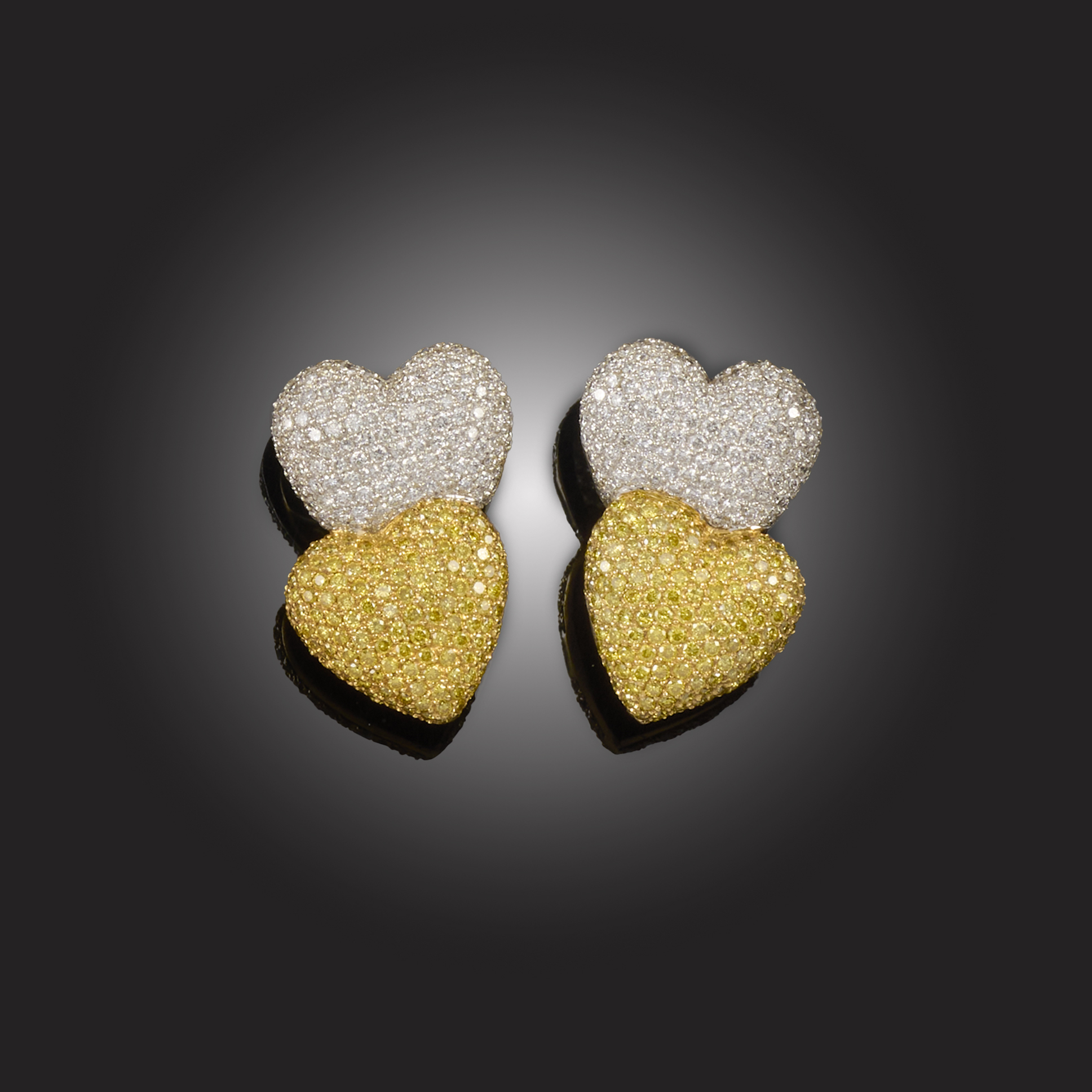 DIANOOR, A PAIR OF FANCY YELLOW AND WHITE DIAMOND EARRINGS, designed as two interlocking hearts, each pavé-set with fancy yellow and colourless diamonds respectively, signed Dianoor, stamped 750 and D12.86, length 2.8cm, folding post and clip fittings
