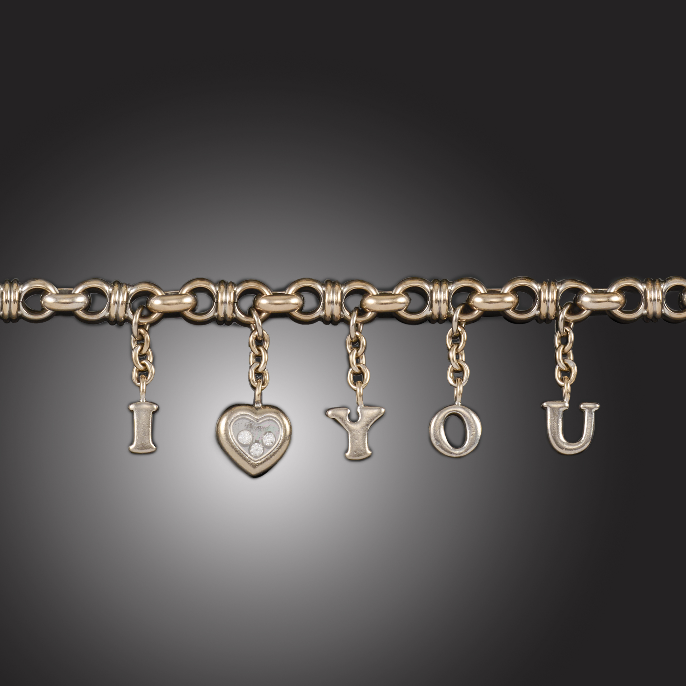 CHOPARD, A GOLD 'HAPPY DIAMONDS' CHARM BRACELET, the single row of fancy linking suspending five charms spelling 'I LOVE YOU', with love represented by a heart-shaped charm with a glazed compartment enclosing three floating round brilliant-cut diamonds in gold collets, signed Chopard, French control mark, length 20.7cm, gross weight 36g