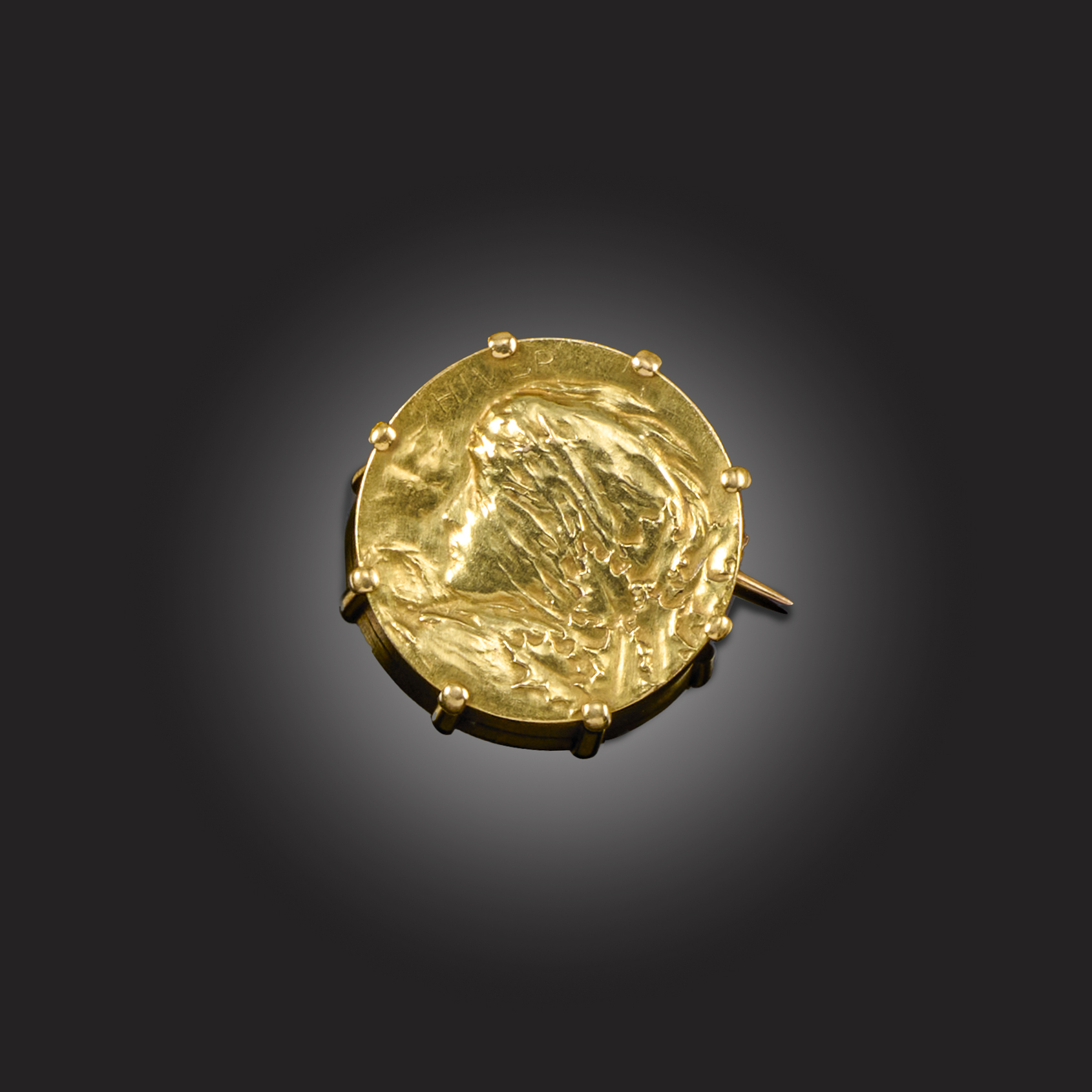 AN ART NOUVEAU GOLD BROOCH, of circular design, decorated with an allegorical depiction of Winter in bas relief below the title 'Hiver', French control mark and half struck maker's lozenge, width 2.4cm, gross weight 12g