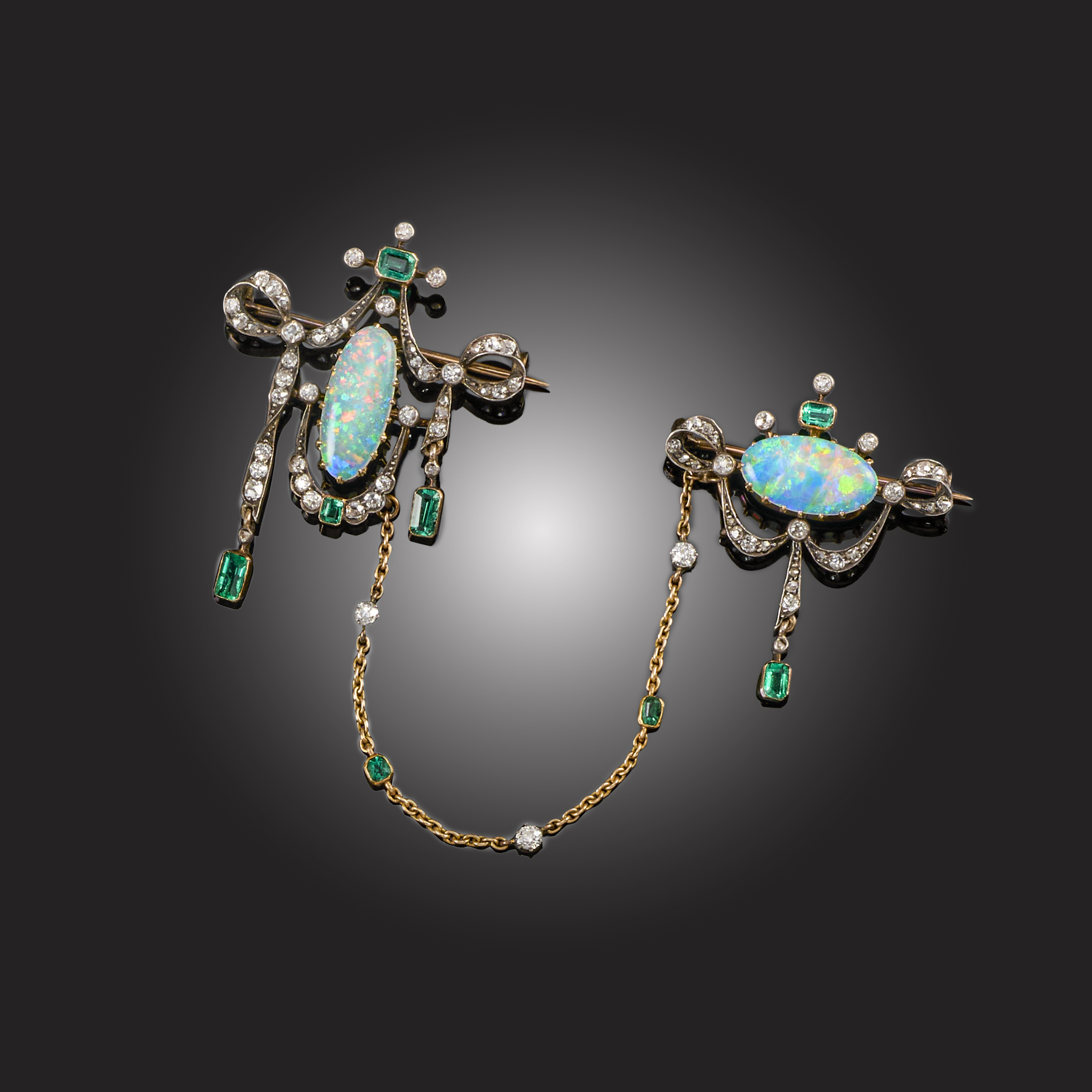 A PAIR OF BELLE EPOQUE OPAL, EMERALD AND DIAMOND BROOCHES / CLOAK CLASP, CIRCA 1900, each centred with an oval cabochon opal within a diamond and emerald ribbon-tie surround suspending emerald drops, mounted in silver and gold, the brooches linked by a detachable fine link gold chain set with alternating diamonds and emeralds, max. brooch length 3.7cm, chain length 8cm