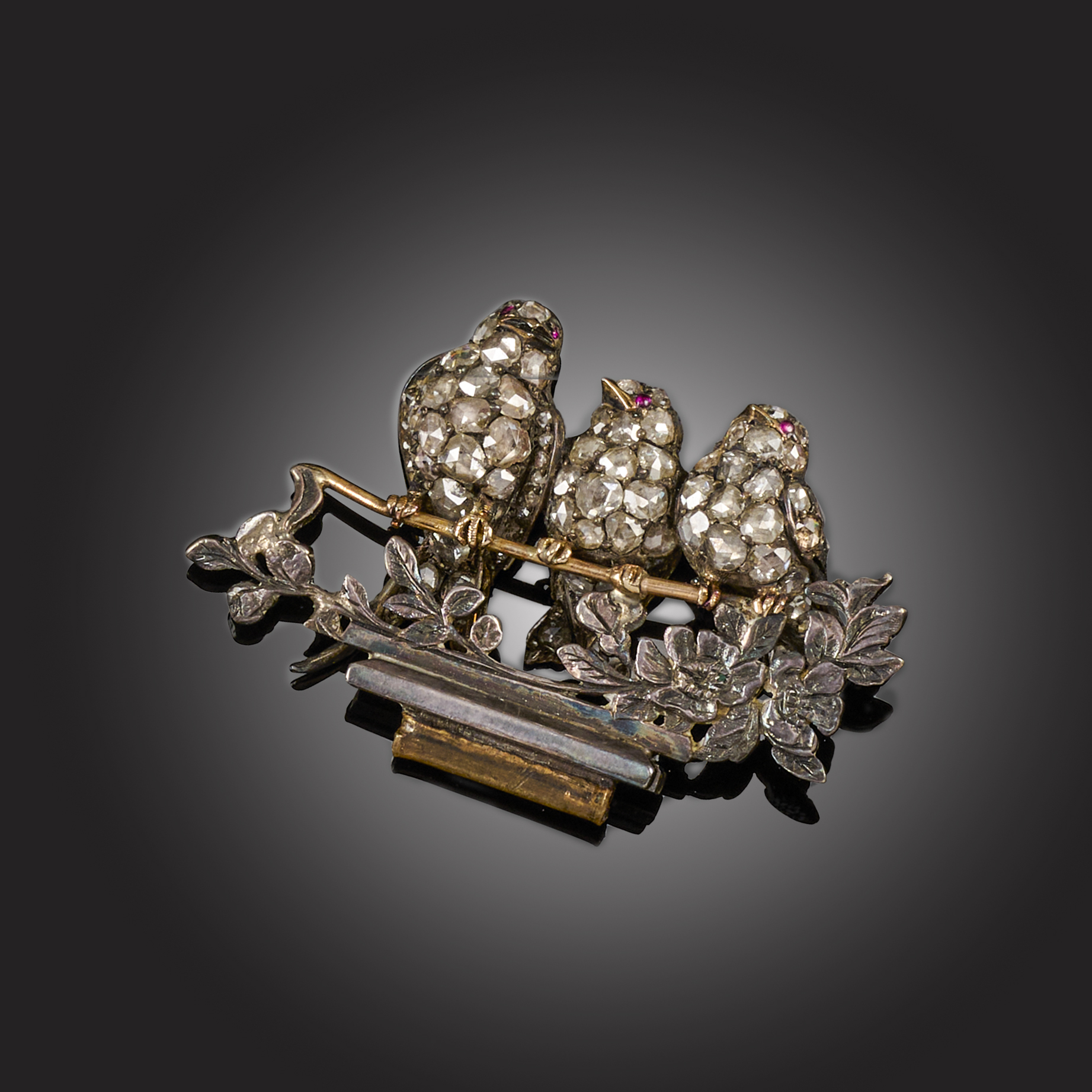 A DIAMOND AND RUBY SET BAG CLASP, in the form of a trio of songbirds perched on a foliate decorated branch, pavé-set with rose-cut diamonds and cabochon ruby eyes, in silver with gold decoration, length 5cm
